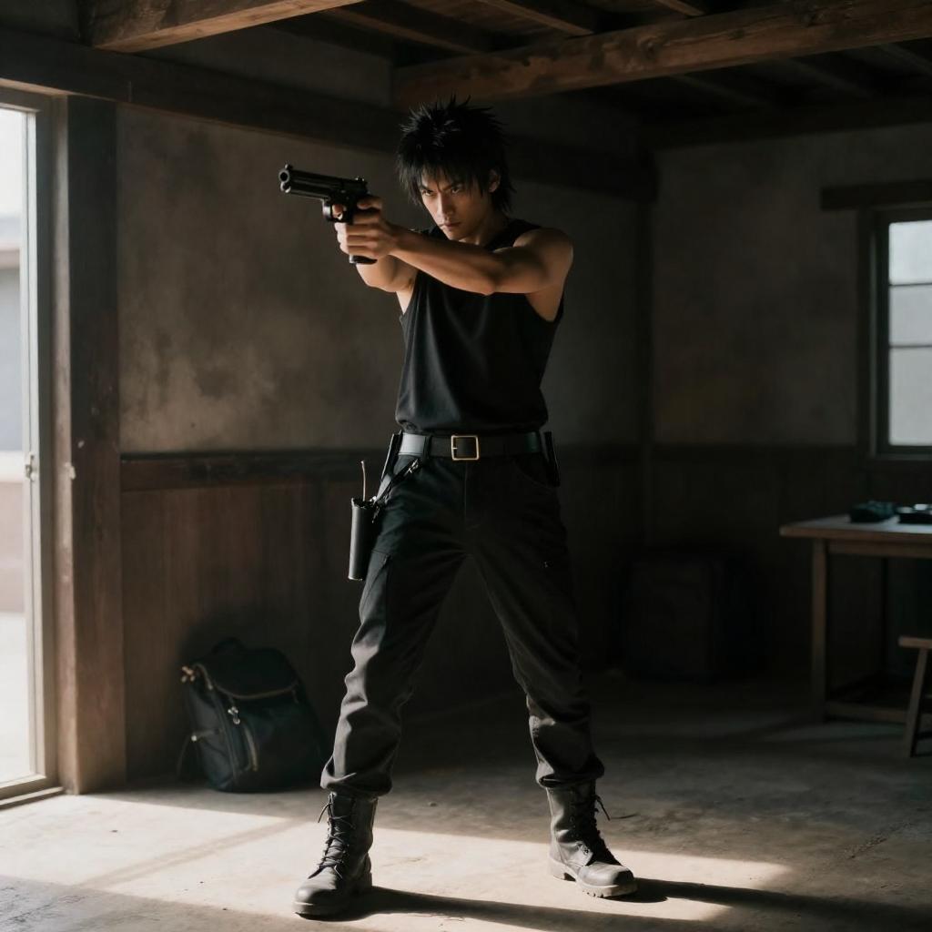 Photograph of a young man with spiky black hair, wearing a black sleeveless shirt, black pants, and boots, standing in a dimly lit, rustic, wooden building. He holds a gun to his right shoulder, aiming forward. Sunlight streams in from the left, casting shadows. A black bag is on the ground behind him.