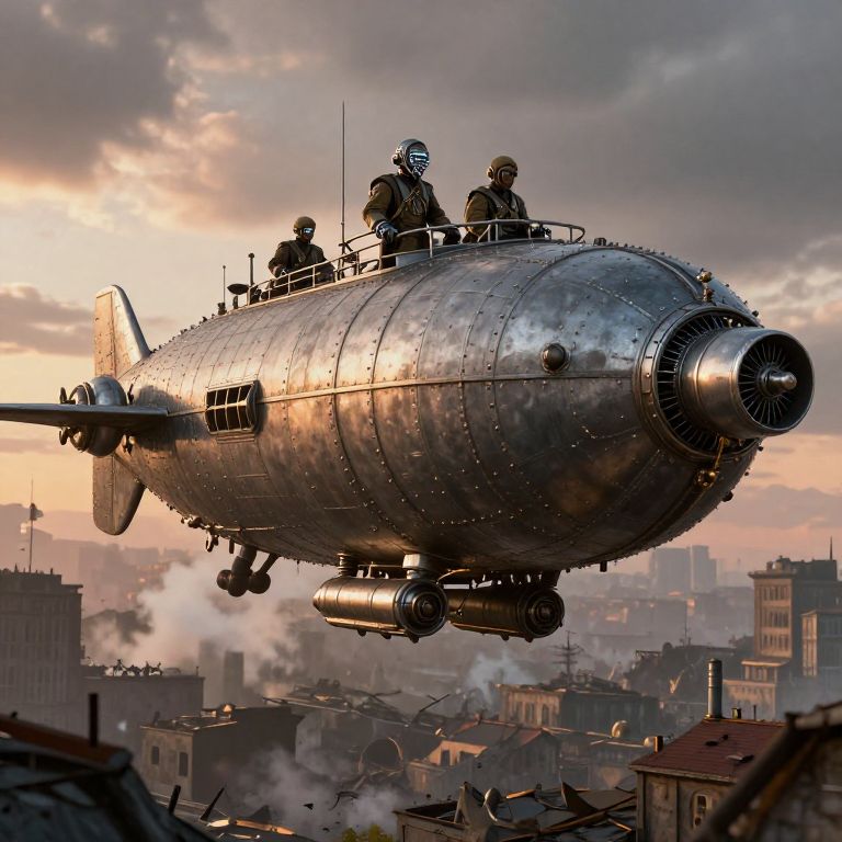 WW1 dieselpunk airship hovering over a war-torn European cityscape, retro-futuristic design with bulky diesel engines and riveted metal panels, crew in vintage flight gear with cybernetic enhancements, steam and exhaust blending into a moody sunset background.