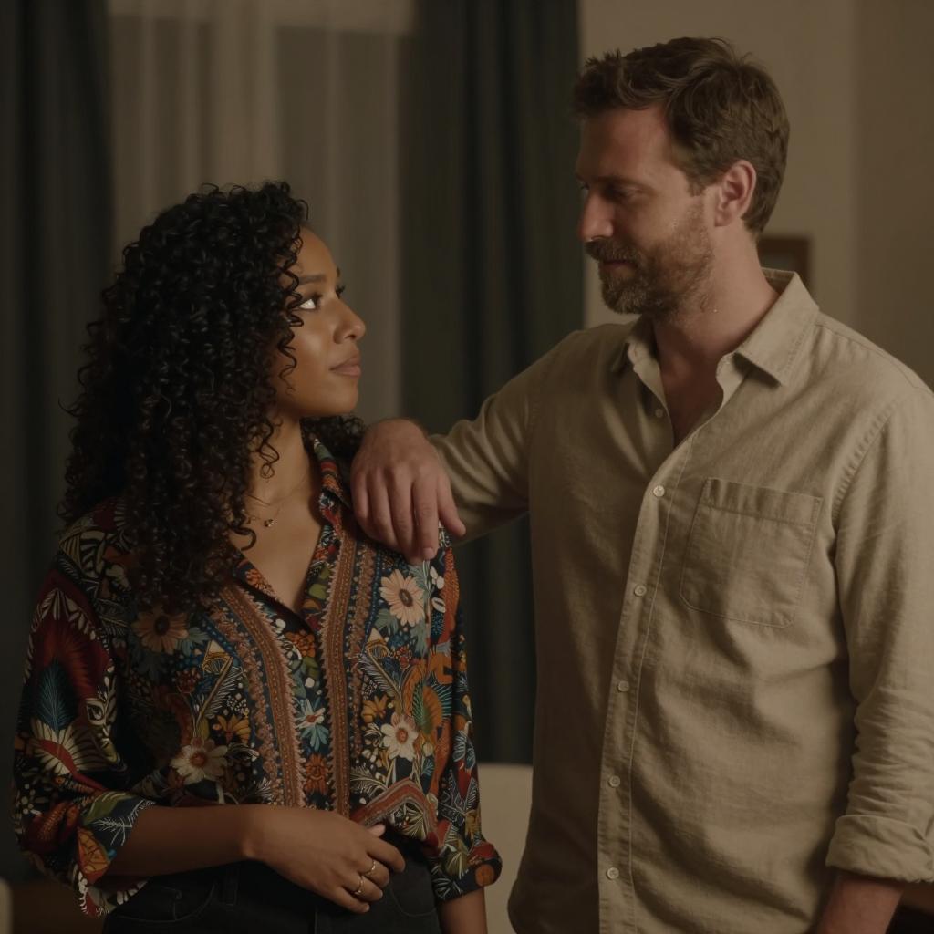 Photograph of a man and woman standing close, smiling at each other. Man with dark brown hair, wearing orange jacket and pink shirt, looking left. Woman with curly dark hair, wearing black t-shirt with graphic and colorful earrings, smiling broadly. Wooden door in background. Warm indoor lighting. Both looking at each other with friendly expressions.