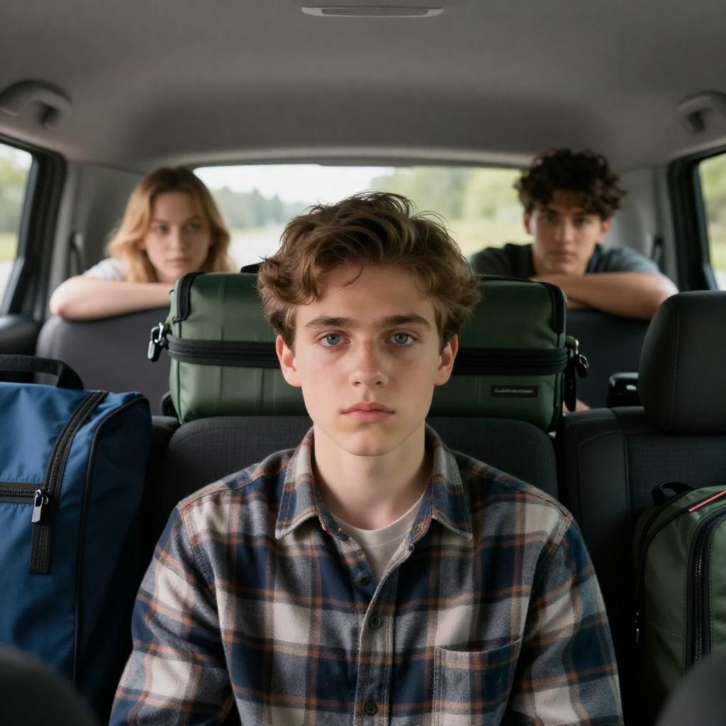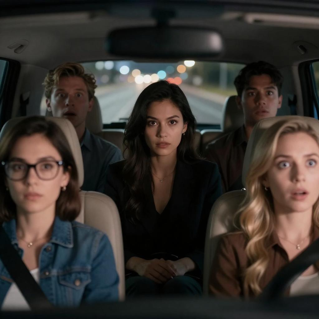 Photograph of three people in a car at night. Front window: young man with messy brown hair, open mouth. Middle window: woman with blonde hair, surprised expression, pink top, gray vest. Right window: bearded man with closed eyes, hands on steering wheel. Dim, blue-tinted interior.