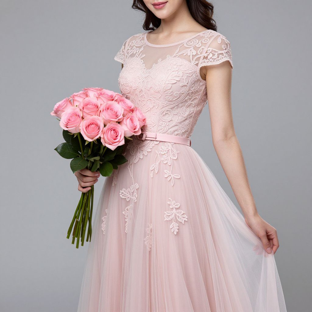 Elegant woman wearing a pink lace-embroidered occasion dress with a tulle skirt, gracefully holding a bouquet of pink roses to her left side.
