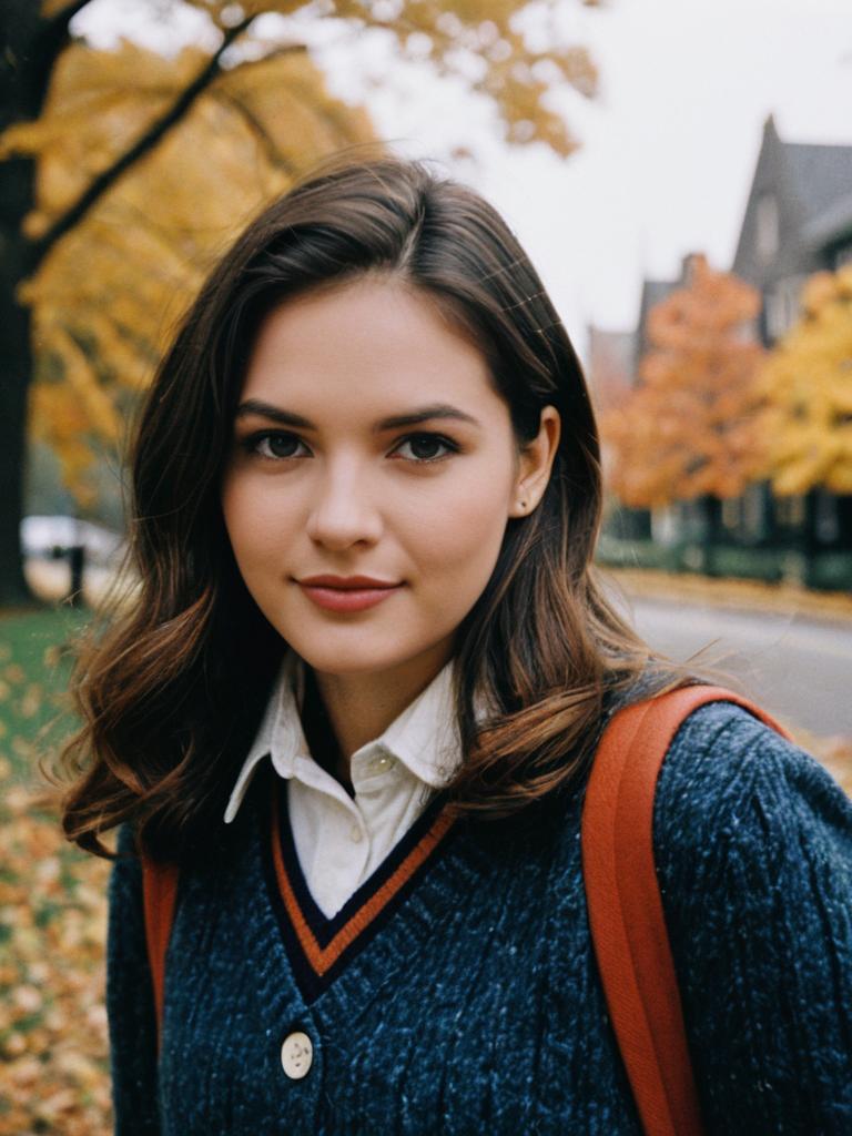 Woman in Preppy Fall Outfit, cinematic realism, cozy editorial photo