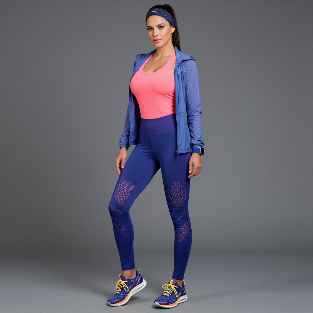 Photograph of a fit woman with long dark hair in a ponytail, wearing a blue headband. She has a light brown skin tone and is dressed in a bright pink tank top, blue mesh jacket, and high-waisted, dark blue mesh leggings. Her athletic shoes are blue with yellow laces and white soles. She stands against a plain gray background, slightly leaning to her right, with a confident expression. The image has a studio lighting setup, highlighting her figure and outfit.