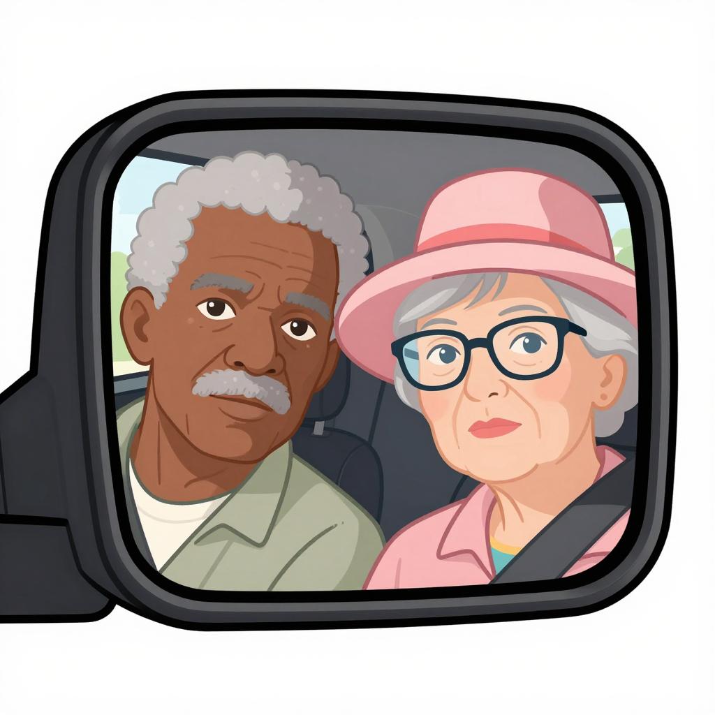Illustration of a car side mirror reflecting two people's faces. An older black man with curly gray hair and a mustache on the left, and an older white woman with glasses and a pink hat on the right. Both have intense expressions. The background is the car's interior, visible only around the mirror.