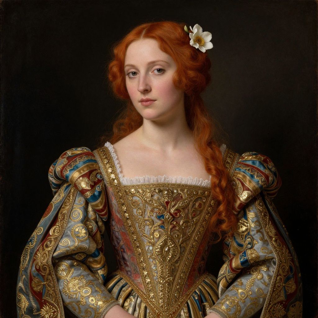 Renaissance-style portrait of a fair-skinned woman with red hair, wearing an ornate, gold-embroidered dress, and a white