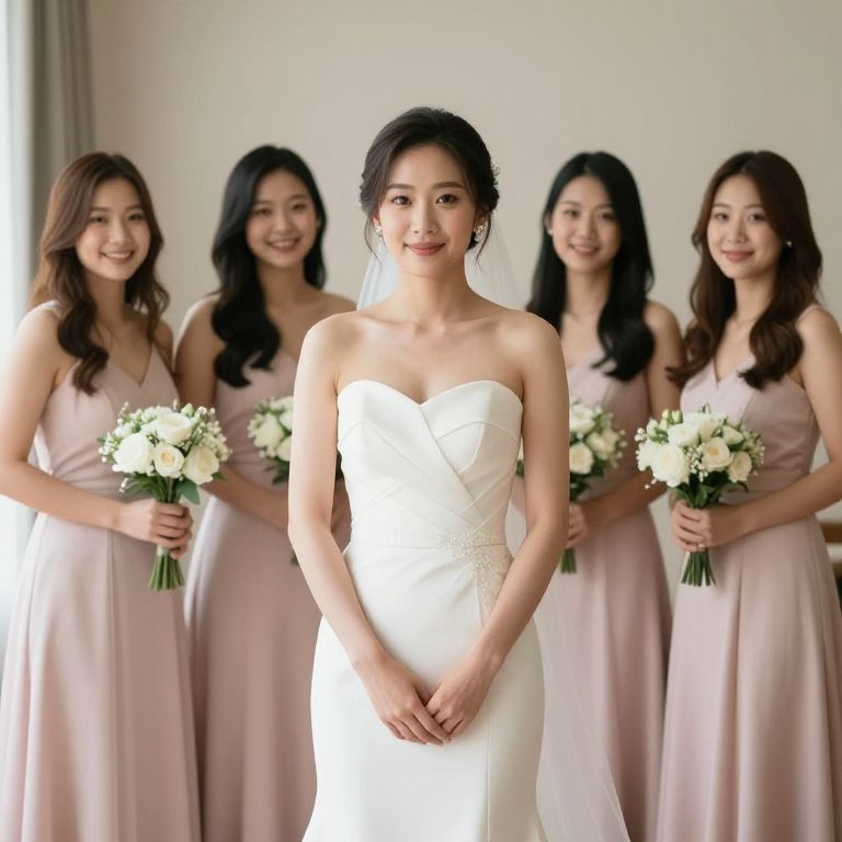 Asian Bridesmaid Clothes, bride in a strapless dress standing in front of her bridesmaids