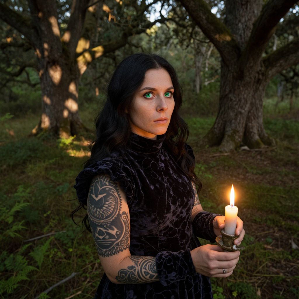 Photograph of a woman with long black hair, green eyes, and intricate black tattoos, holding a lit candle in a forest.