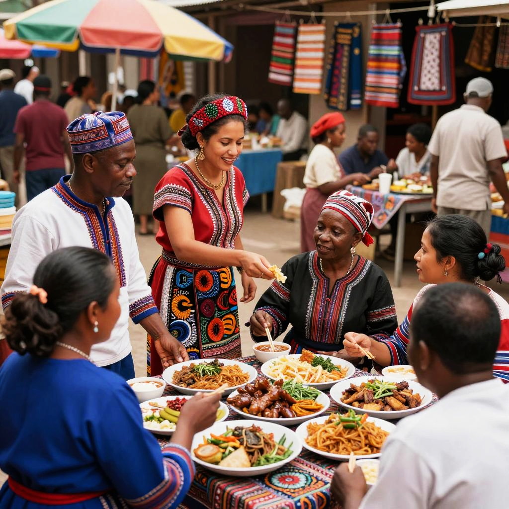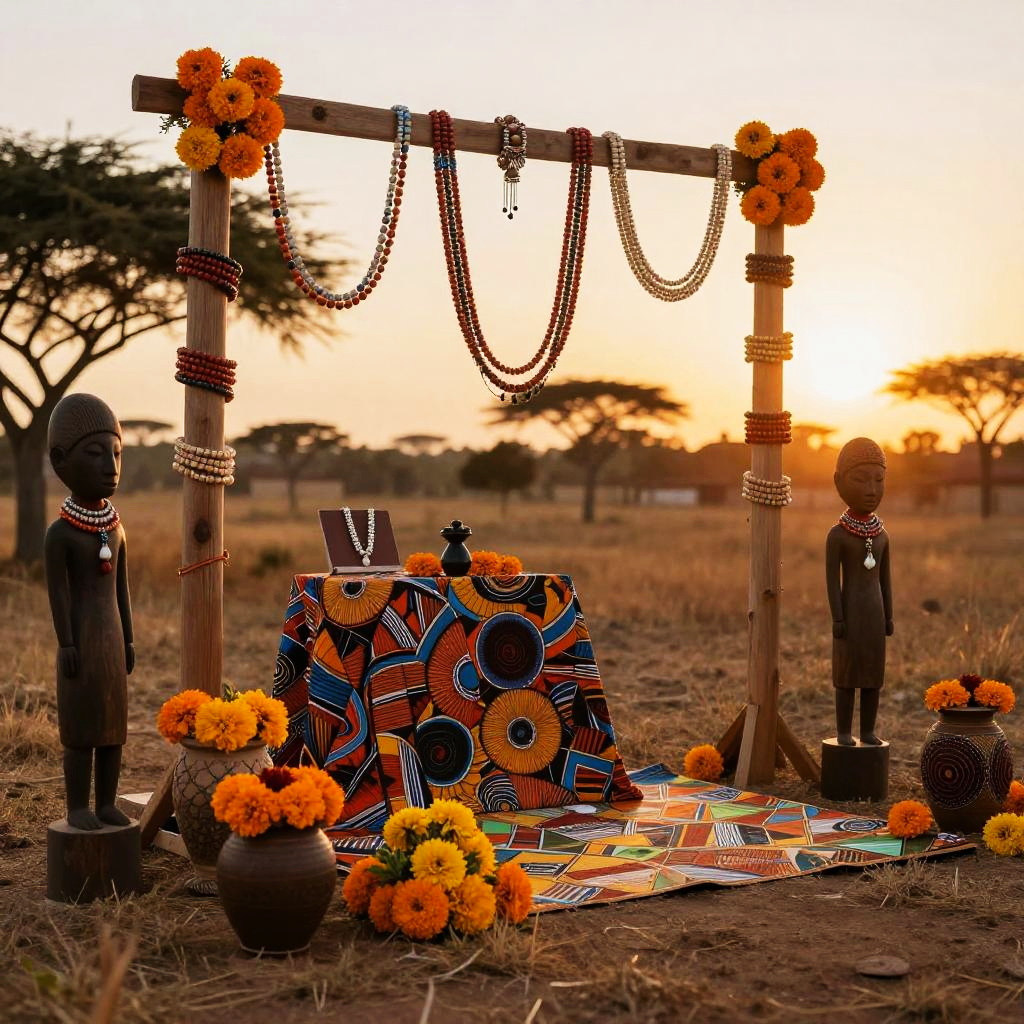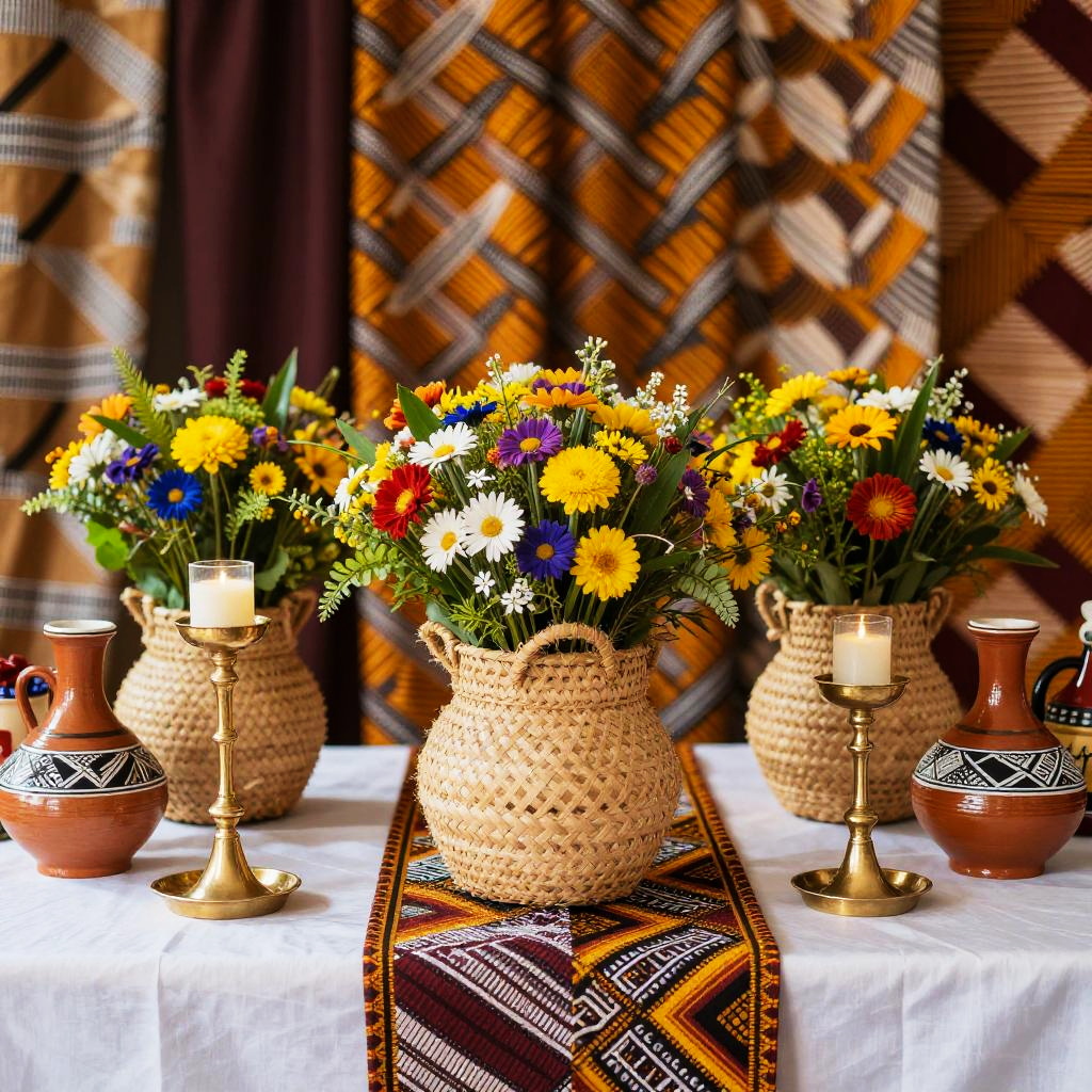 African wedding decorations showcasing rich mud cloth textiles, handwoven baskets filled with vivid wildflowers, elegant brass candle holders, and traditional pottery arranged on tables.
