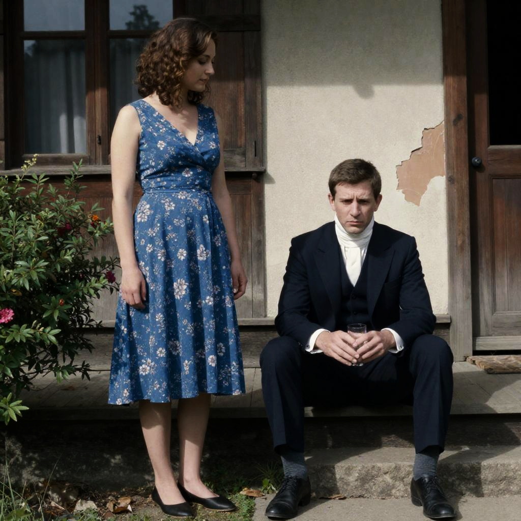 A photograph of a woman in a blue floral sleeveless dress standing next to a man sitting on stone steps in front of a rustic wooden house. The man is wearing a dark suit with a white cravat, holding a glass in his hands, and has a serious expression. The woman has curly brown hair and is looking down. Sunlight casts shadows on the beige wall with visible broken plaster. Green bushes and flowers are seen beside the steps.