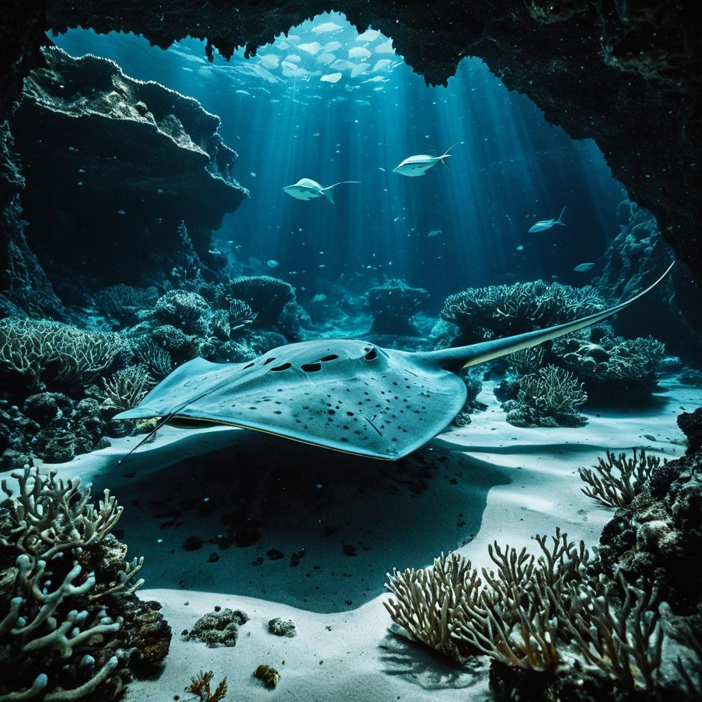 Underwater scene depicting a stingray majestically gliding over a sandy seabed inside a murky cave. The cave is illuminated by blue bioluminescent light filtering through water, highlighting the fine bone structures and luminous textures of the stingray and surrounding marine flora. Various small fish swim near the glowing coral reefs in the mysterious aquatic cave environment.