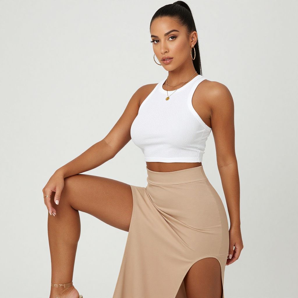 Photograph of a confident woman with medium brown skin and dark, slicked-back hair. She wears a white, ribbed, sleeveless crop top that reveals a hint of her midriff and a high-waisted, beige skirt with a thigh-high slit. Her right leg is raised and bent at the knee, resting on an invisible surface. She accessorizes with large hoop earrings and a delicate gold necklace. Her expression is neutral, with subtle makeup emphasizing her eyes and lips. The background is pure white, making her the focal point. She stands with a relaxed yet poised posture, exuding a modern, chic style.