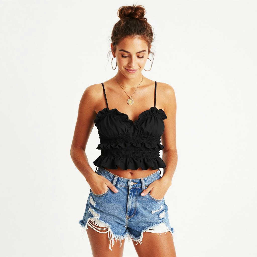 Photograph of a young woman with a light tan, standing against a bright white background. She has her brown hair in a messy bun, wears a black, ruffled, spaghetti-strap top, and distressed denim shorts with frayed edges. She accessorizes with large hoop earrings and a circular pendant necklace. She's looking down with a slight smile, hands in her pockets. The image has a high-contrast, almost hyper-realistic style.