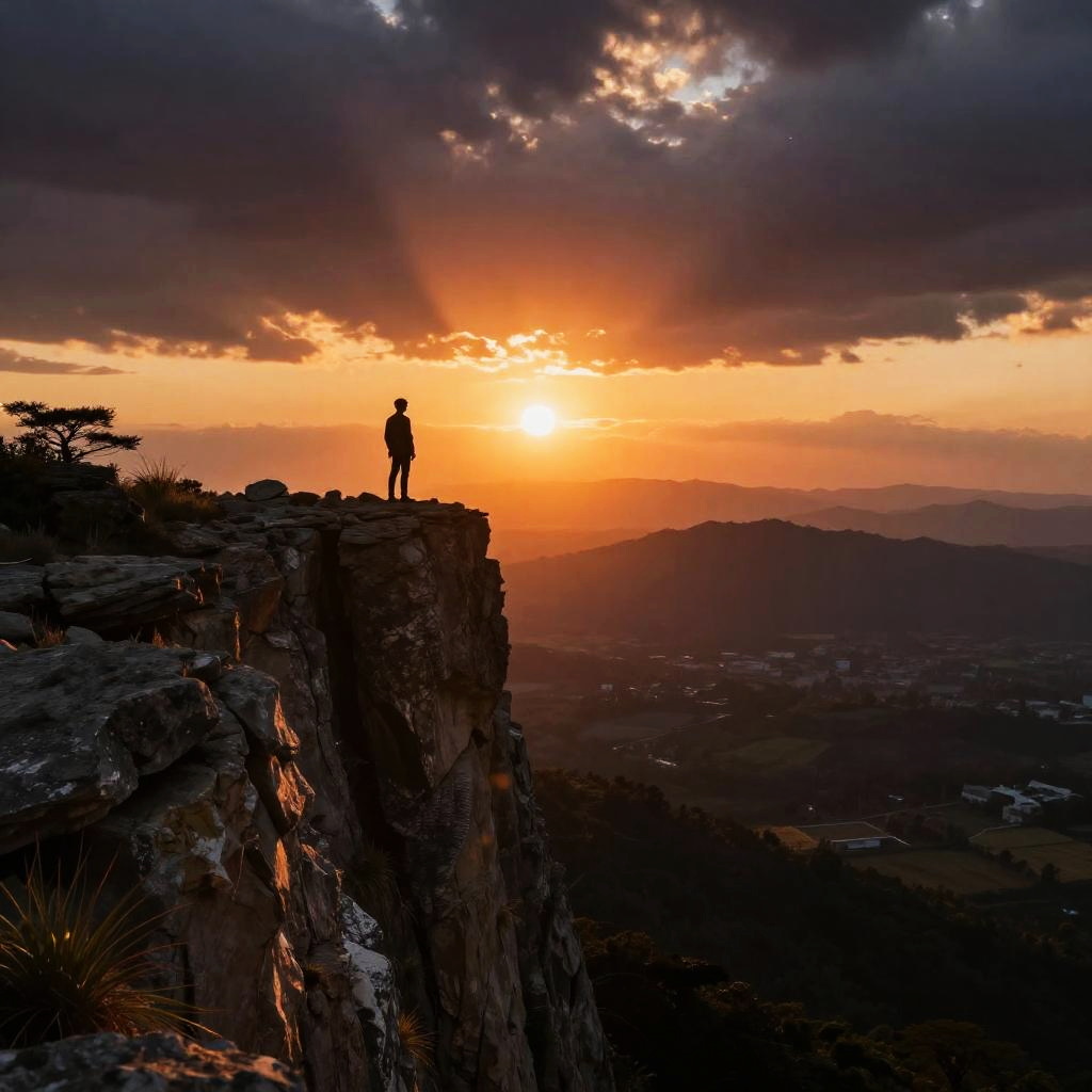 Dramatic lighting digital art scene featuring a lone figure standing on a cliff at sunset, intense shadows and rich colors highlighting the powerful atmosphere