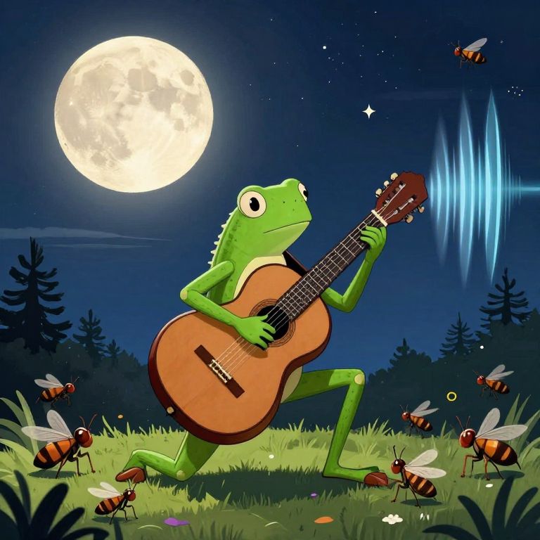 Digital illustration: Green frog playing guitar under bright full moon, surrounded by buzzing bees in a starry night forest.