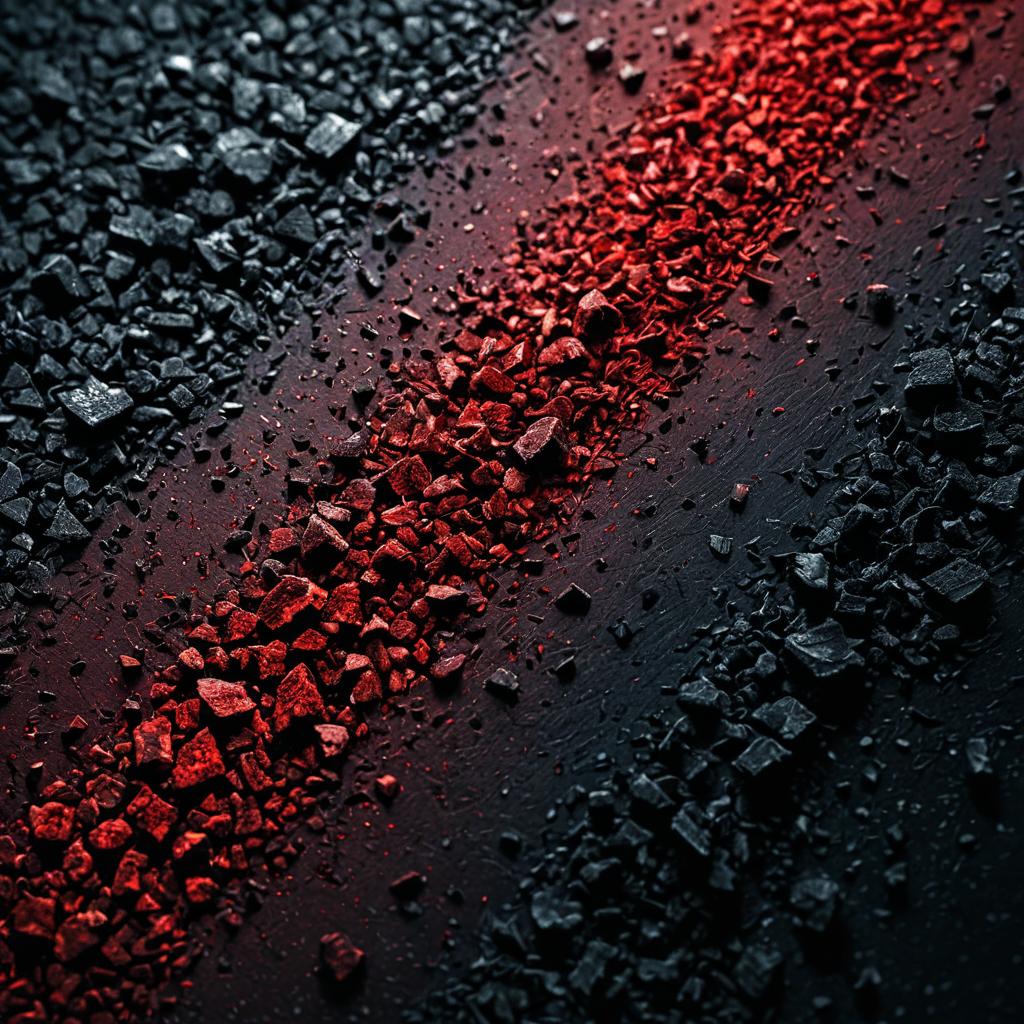 Close-up of crushed rocks or gravel arranged in a vertical stripe pattern with a red and black color scheme. The image features intricate textures of broken stone pieces with a worn, detailed surface and gradient lighting effect transitioning from darker tones at the bottom to brighter red highlights.