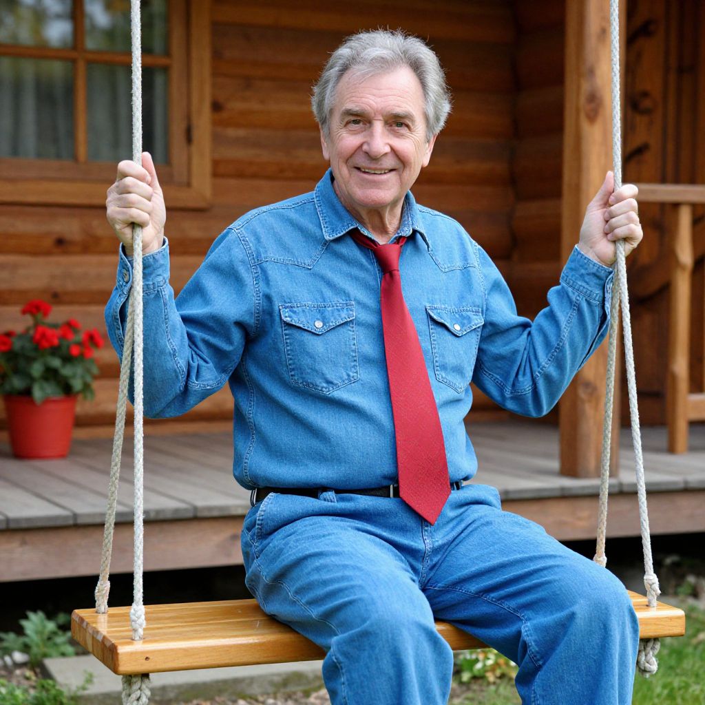 A middle-aged man with gray hair and a friendly smile sits on a wooden swing. He's wearing a bright blue denim shirt with red tie and matching blue pants. His hands grip the swing's white ropes. The background shows a cozy wooden cabin with red potted flowers on the porch. The image has a vibrant, colorful look.