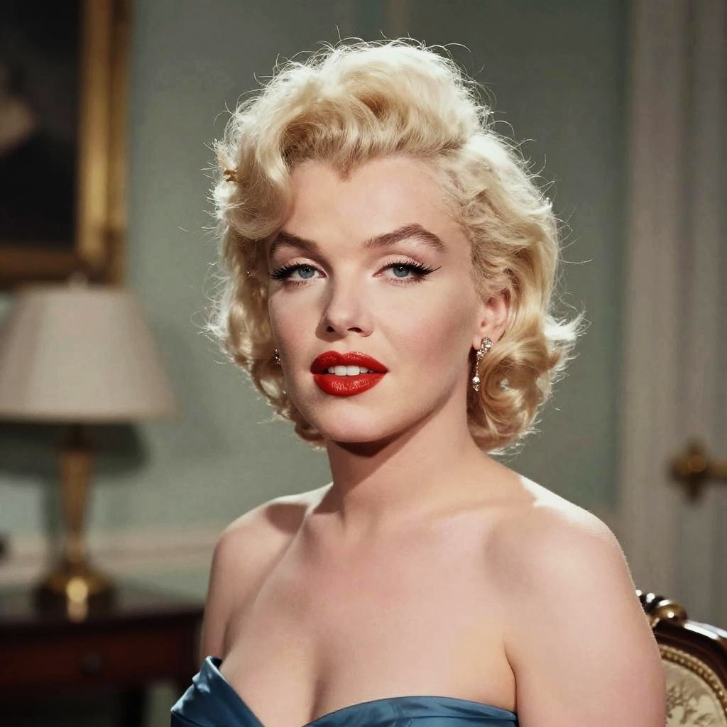 Marilyn Monroe Wig, blonde woman with blue eyes and red lips posing in a room