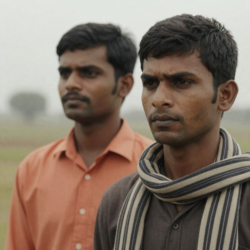 Photograph of three men with long, curved wooden staffs. Central man with red hood and beard, intense gaze, right hand on chest. Left man in brown hood, partially visible. Right man in white hood, partially obscured. Overcast sky background.