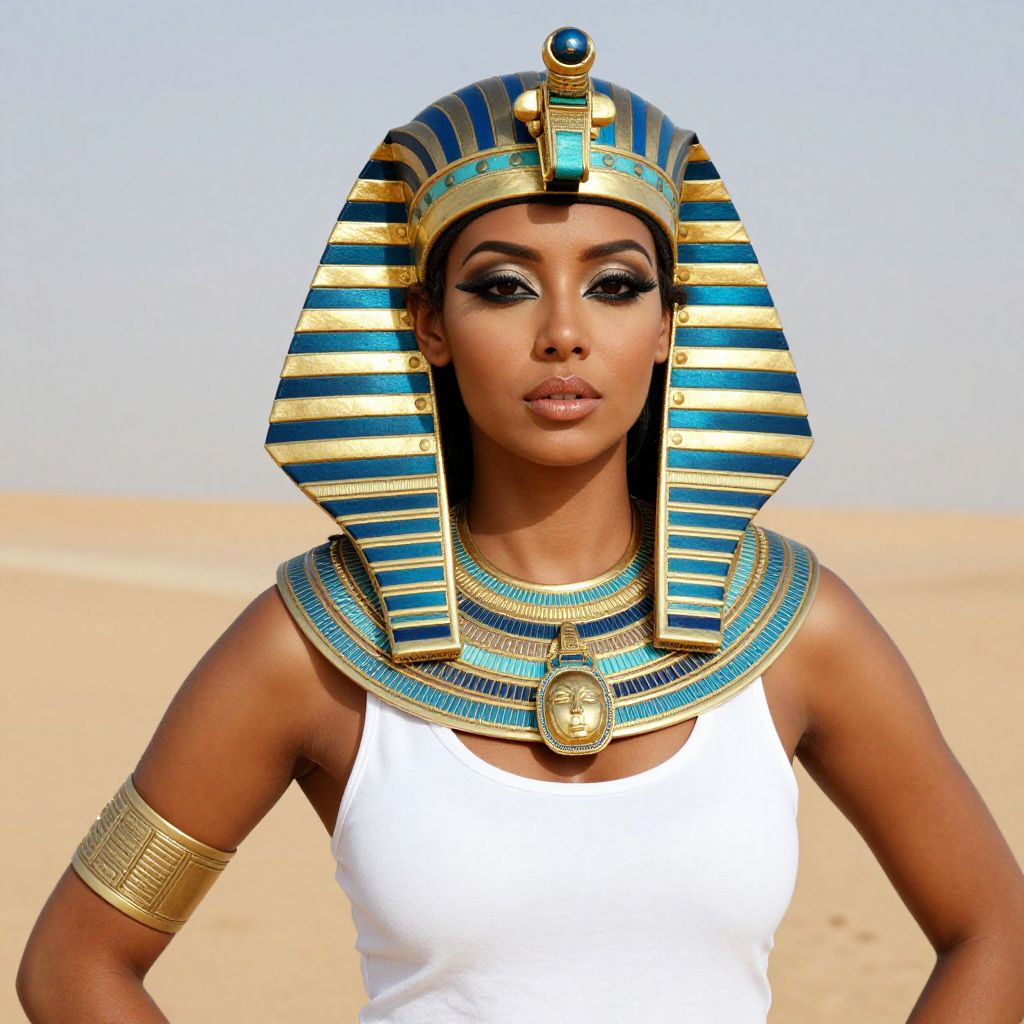 Photograph of a confident woman with dark skin and striking makeup, wearing an Ancient Egyptian-inspired outfit. She has a blue and gold striped headdress with a gold and blue necklace, and a white tank top. Her arm is adorned with a gold armlet. The background is a sandy desert under a clear sky. Her makeup is bold, with dark eyeliner and full lips.