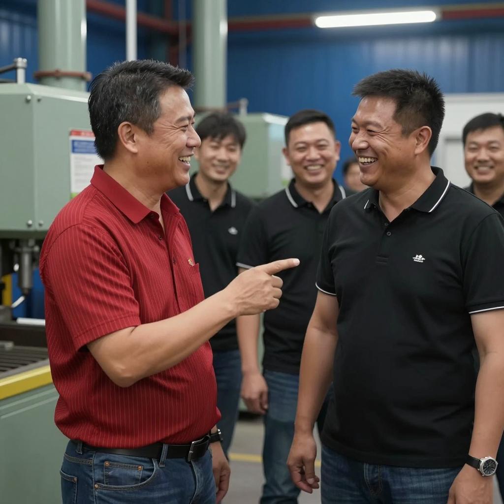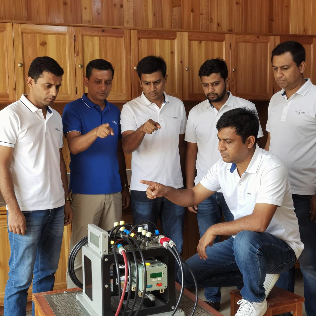 Photograph of six men in a wooden room, focused on a complex machinery setup. Five men stand, one seated. Three men point, two in white shirts, one in a blue shirt, all casual attire. Machinery has cables and controls. Seated man in white shirt, blue jeans, and white sneakers. Intense expressions on standing men. Wooden cabinets in background. Bright lighting.