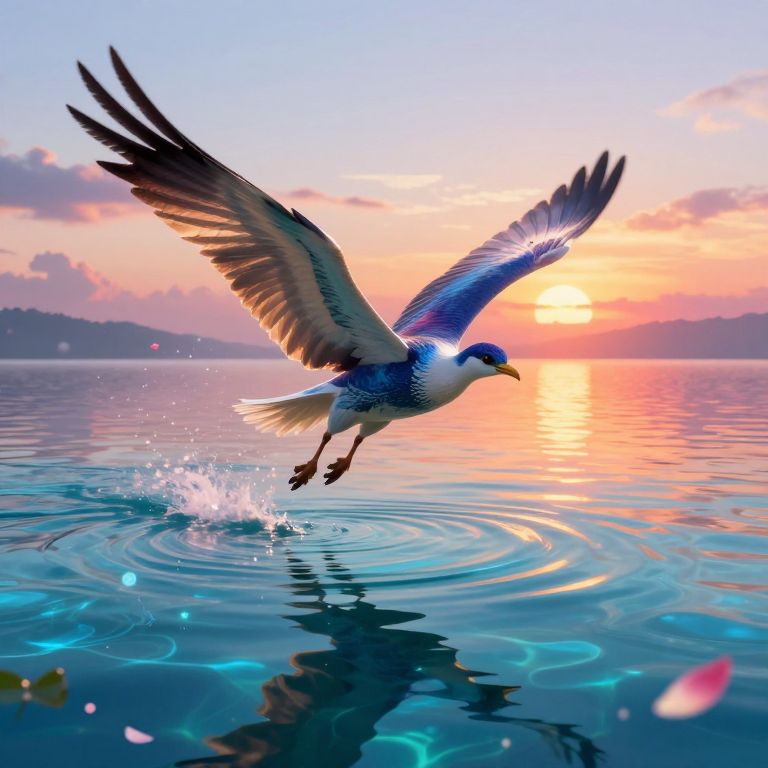 Dynamic scene of the mahoraha flying over a crystal-clear lake reflecting a colorful sunset, its powerful wings creating ripples in the water, surrounded by floating petals and glowing orbs, high fantasy illustration.