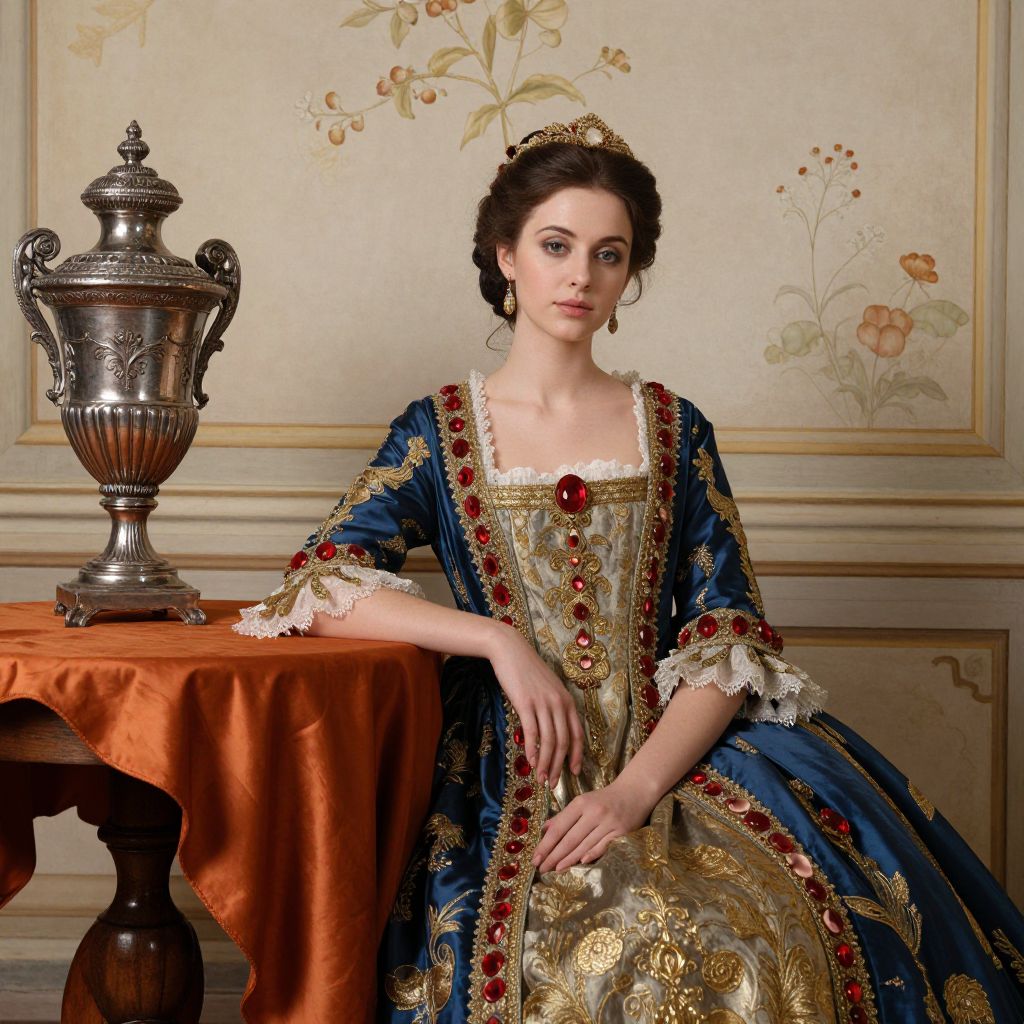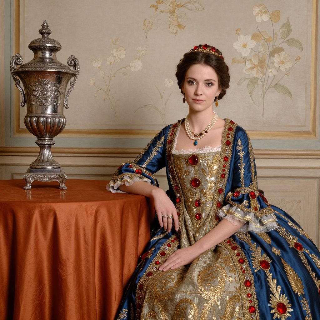 Elegant portrait of a noblewoman in a luxurious blue gown adorned with gold and red embellishments, seated beside a polished wooden table draped in a rich orange cloth, featuring a silver urn with ornate detailing and a delicate floral mural painted on the wall behind her.