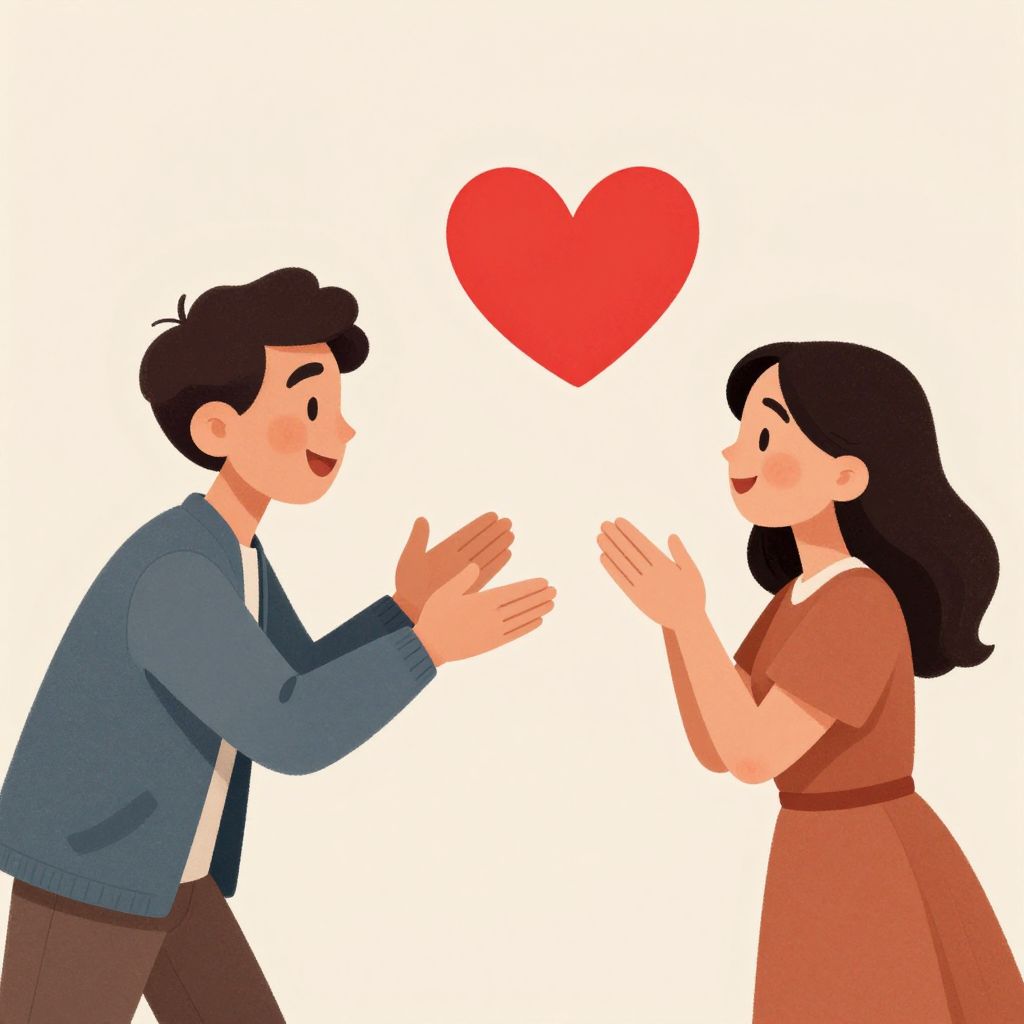 Cartoon illustration of a smiling man and woman facing each other, hands raised, with a red heart between them. Both wear casual clothes; white background