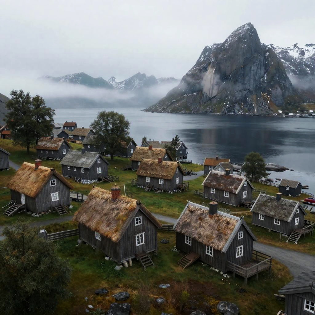 Highly detailed and photorealistic image of a Nordic Viking village in a misty fjord inlet. The village should be composed of intricately detailed wooden houses with thatched roofs, surrounded by snow-covered mountains and tall trees. The lighting should be overcast soft diffuse lighting. The camera should be positioned at a bird's-eye aerial view, looking up at the village and the surrounding landscape. The lens should be a wide-angle lens to capture the expanse of the landscape and the details of the village. The image should feel immersive and authentic, with every element carefully crafted to create a realistic and compelling scene.