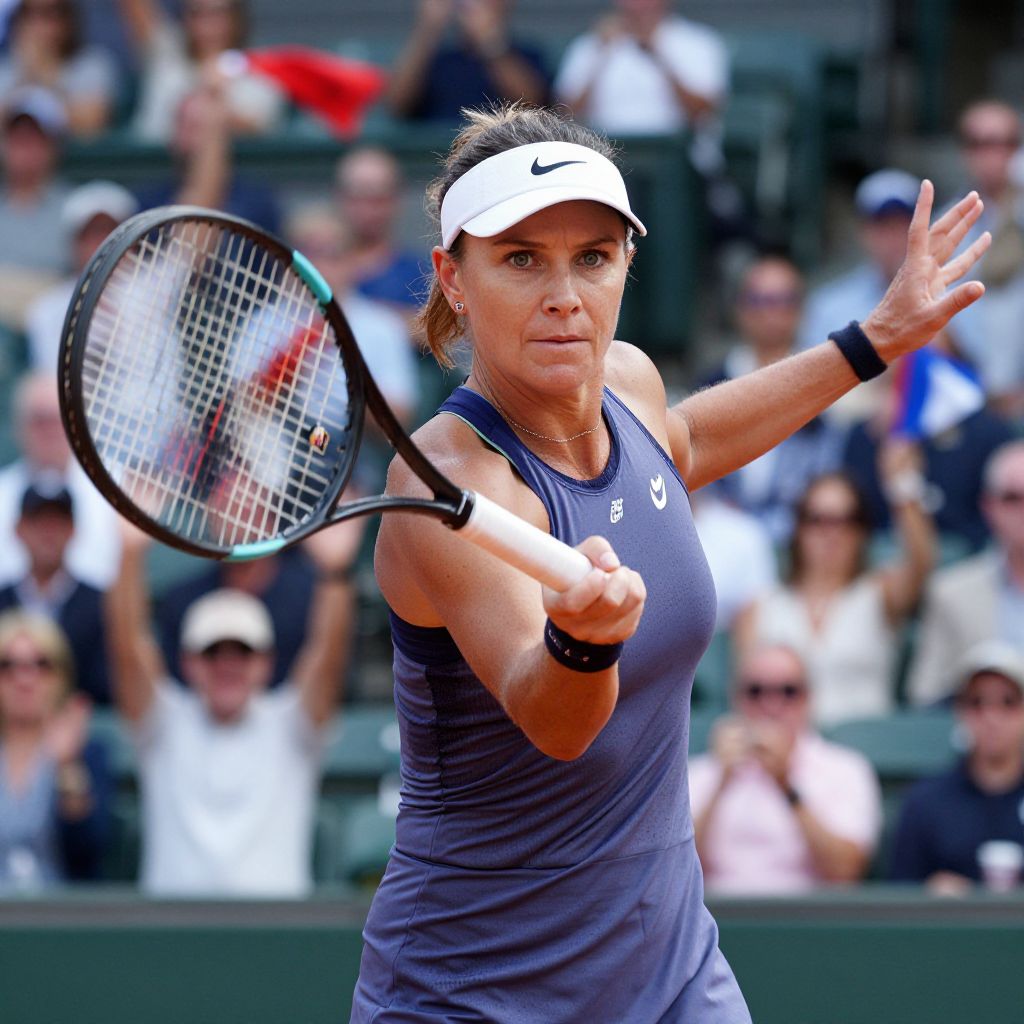 A professional racquet sport tournament moment captured in high detail — a middle-aged woman with sharp green eyes and a poised expression, executing a powerful backhand shot during a clay court match, with the crowd visible in the background, fans waving flags and cheering.