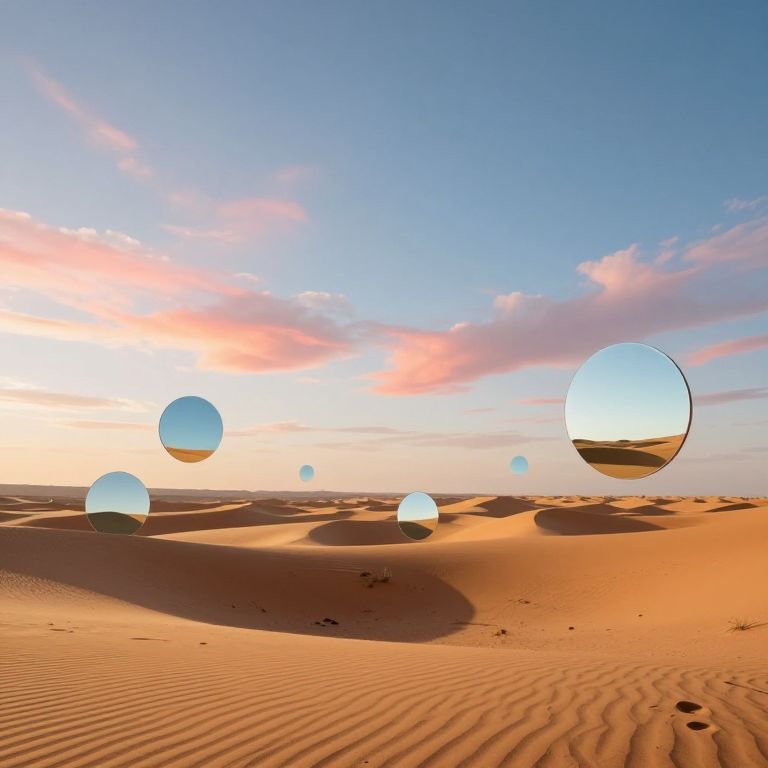 A desert of floating mirrors reflects only memories, casting illusions of alternate lives across a sky painted with forgotten holidays and dreams that never materialized.