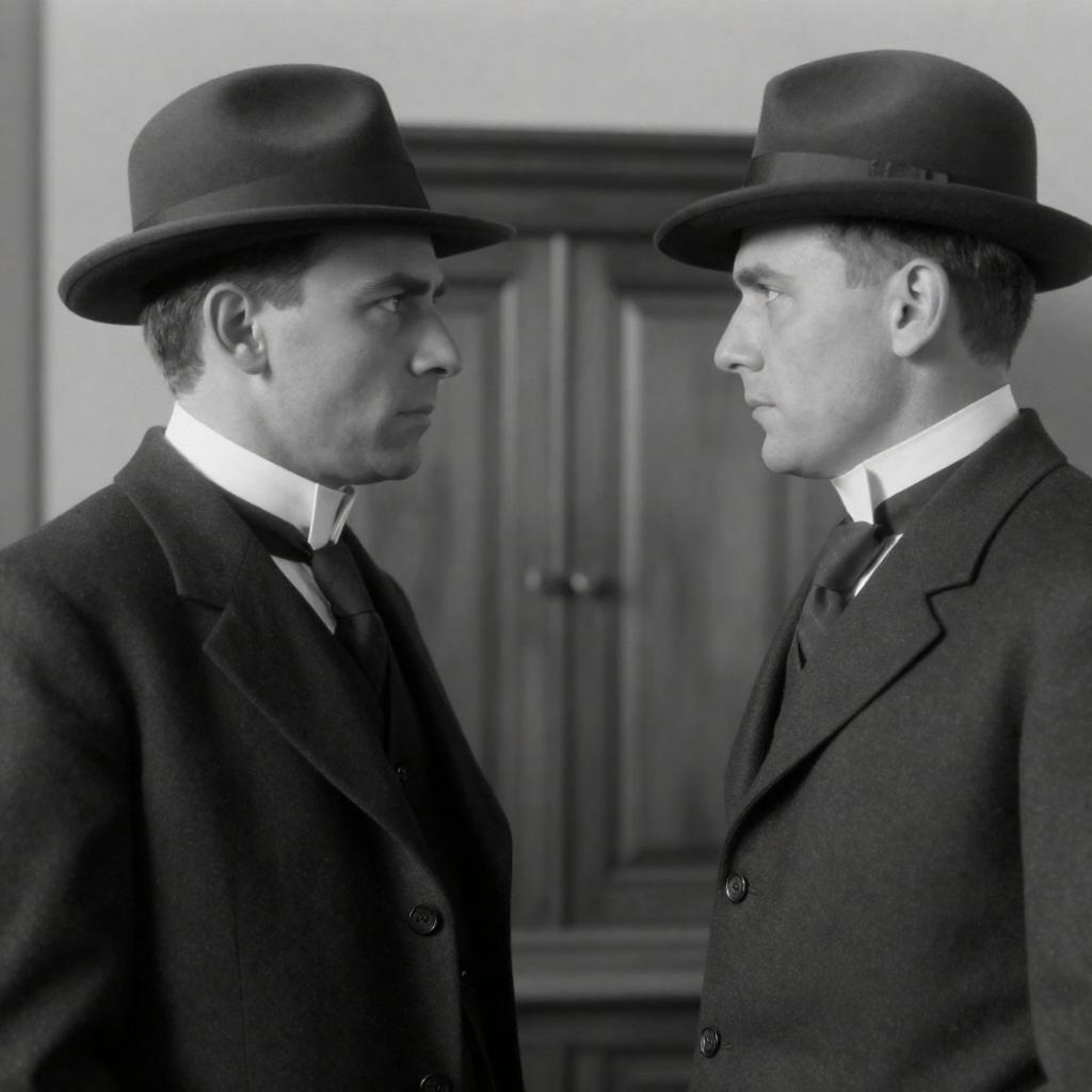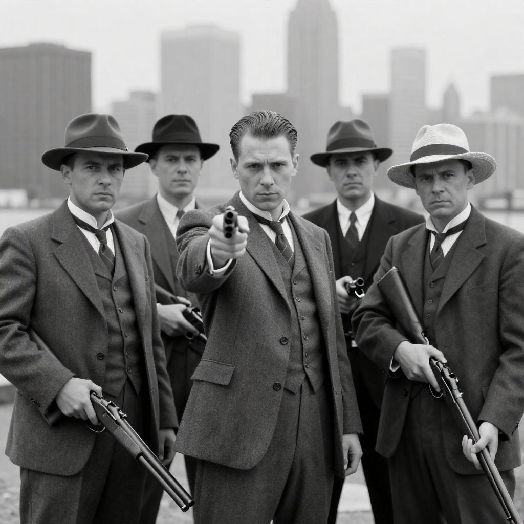 Photograph of five men in 1930s-style suits and hats, standing in front of a city skyline. Central figure, with slicked-back hair, points gun forward. Left: man with hat, holding shotgun. Center-right: two men, one with fedora, holding guns. Right: man with straw hat, holding rifle. Background: black and white cityscape. All men have intense expressions.