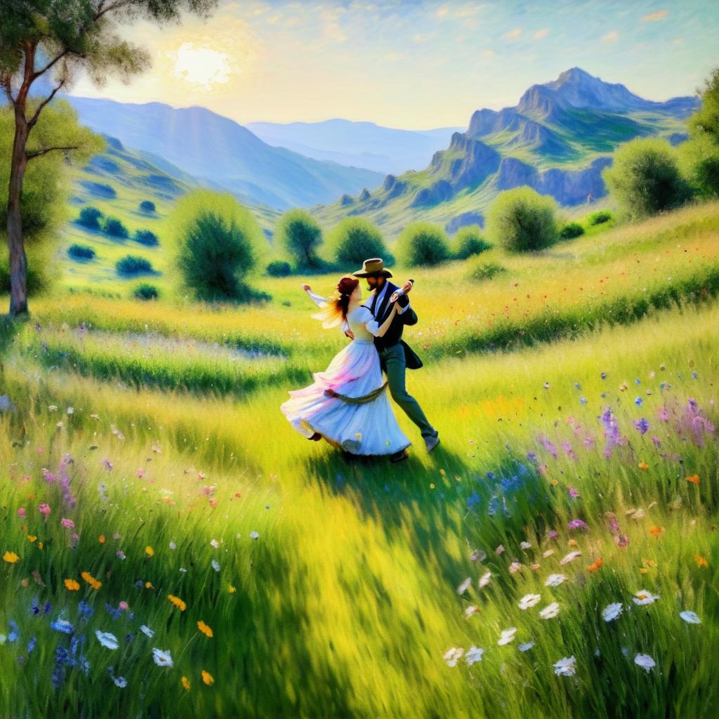 Scenic mountain meadow with wildflowers and a couple dancing. Styled as an Impressionist painting by Claude Monet, Pierre-Auguste Renoir, and Edgar Degas. The setting is bathed in warm, natural light, capturing the tranquility of nature in a detailed, traditional art style.