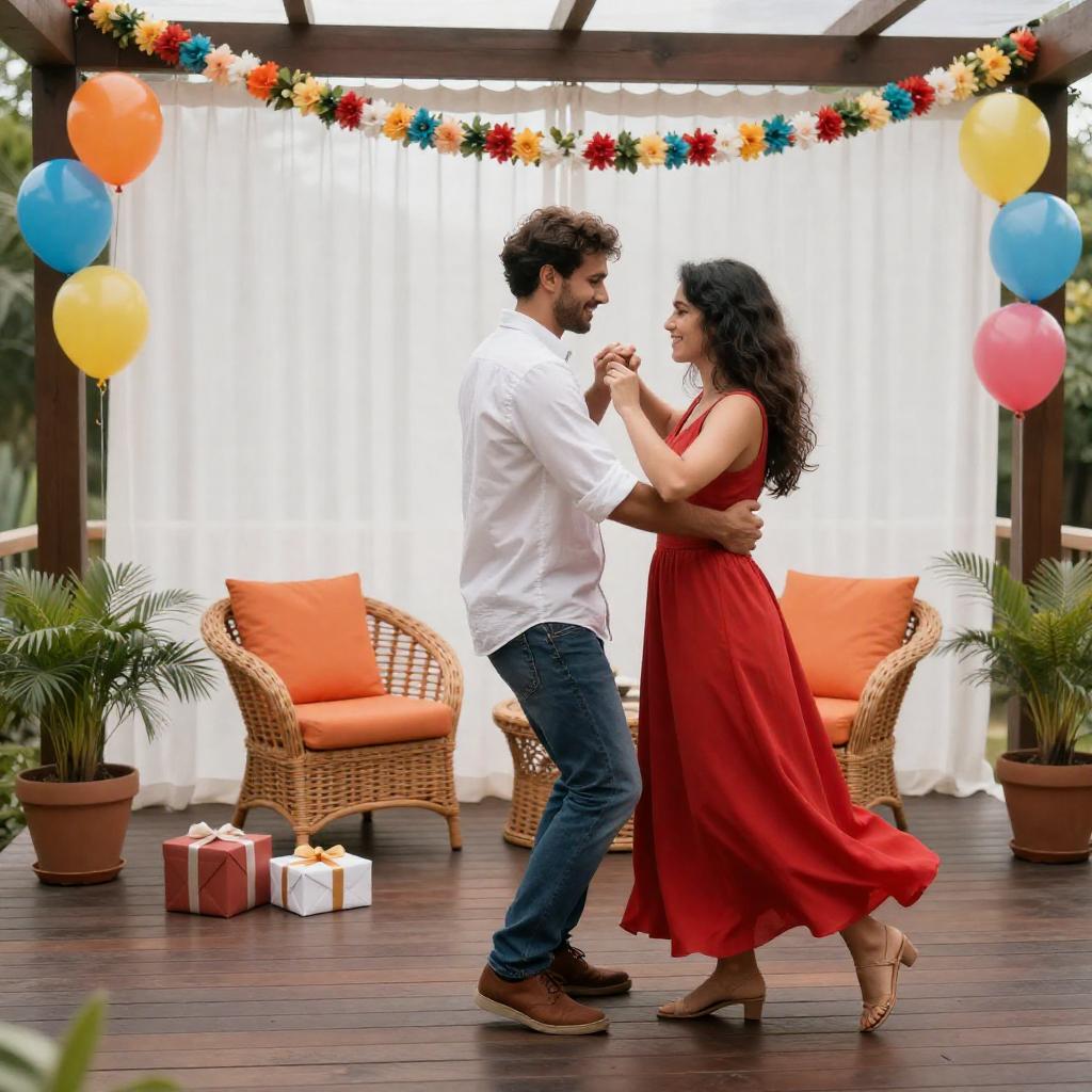 Photograph of a couple dancing on a wooden deck. The man, in a white shirt and blue jeans, holds the hand of the woman, in a red dress. The deck is adorned with floral garlands, colorful balloons, and potted plants. Wicker chairs with orange cushions are in the background, and gifts are scattered on the floor. Bright daylight filters through white curtains.