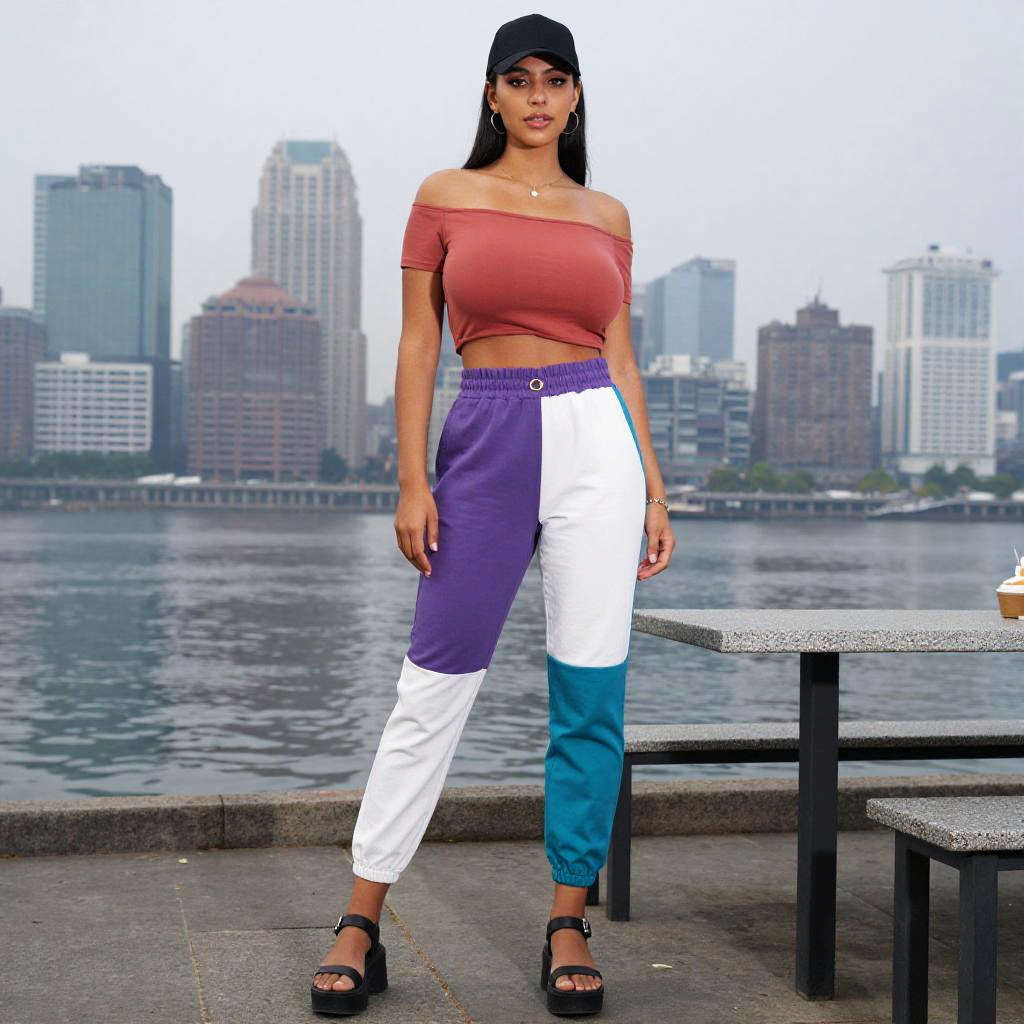 A tall woman in casual streetwear, wearing an off-the-shoulder cropped top in muted terracotta and high-waisted color-blocked joggers with purple, white, and teal, black platform sandals, and a black baseball cap, stands at a riverside table with a city skyline in the background. Cibachrome style. Sexy. Pretty face and beаutiful eyes. Big breasts