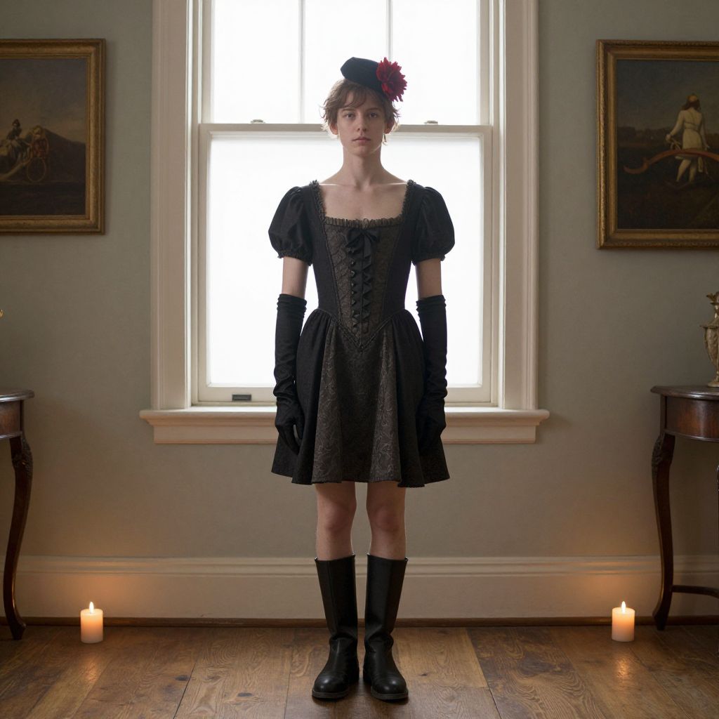 Photograph of a young woman standing in a dimly lit room in front of a large window. She has fair skin, short brown hair, and wears a black, Victorian-style dress with puffed sleeves and a lace bodice, black gloves, and knee-high black boots. A red flower adorns her hair. Two lit white candles are on the wooden floor at her feet. The background includes two framed paintings on the pale green wall, and the window casts a bright light behind her, creating a stark contrast. The room has a classic, elegant feel.