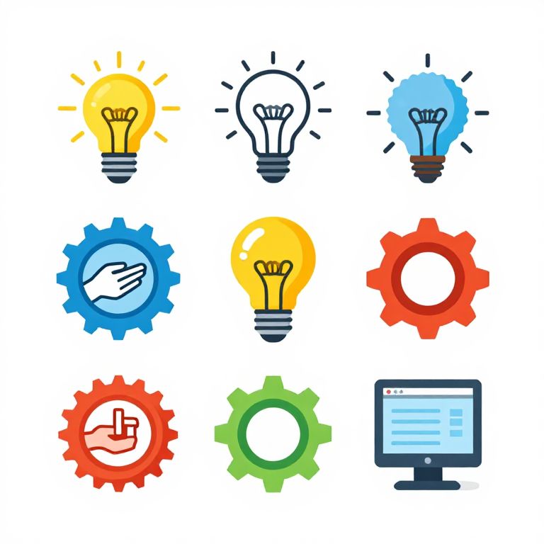 Colorful digital illustration of nine light bulb and gear icons, including glowing bulbs, hand in gear, and a computer screen.
