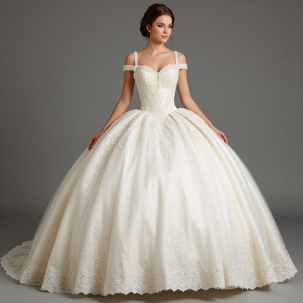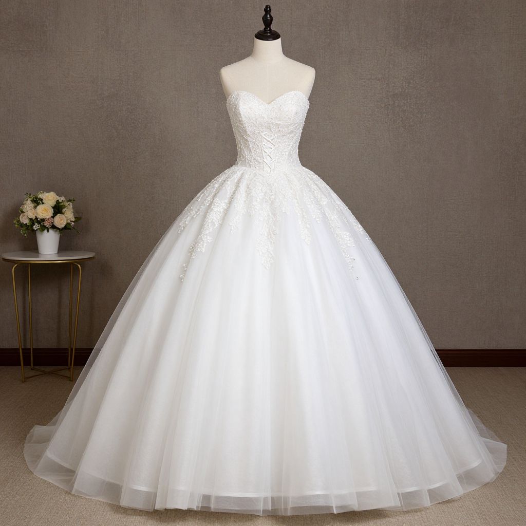 Elegant princess dress displayed on a mannequin, featuring a sleeveless bodice adorned with intricate sequined floral embroidery and a voluminous layered tulle skirt embellished with delicate ribbon accents, perfect for weddings and formal events.