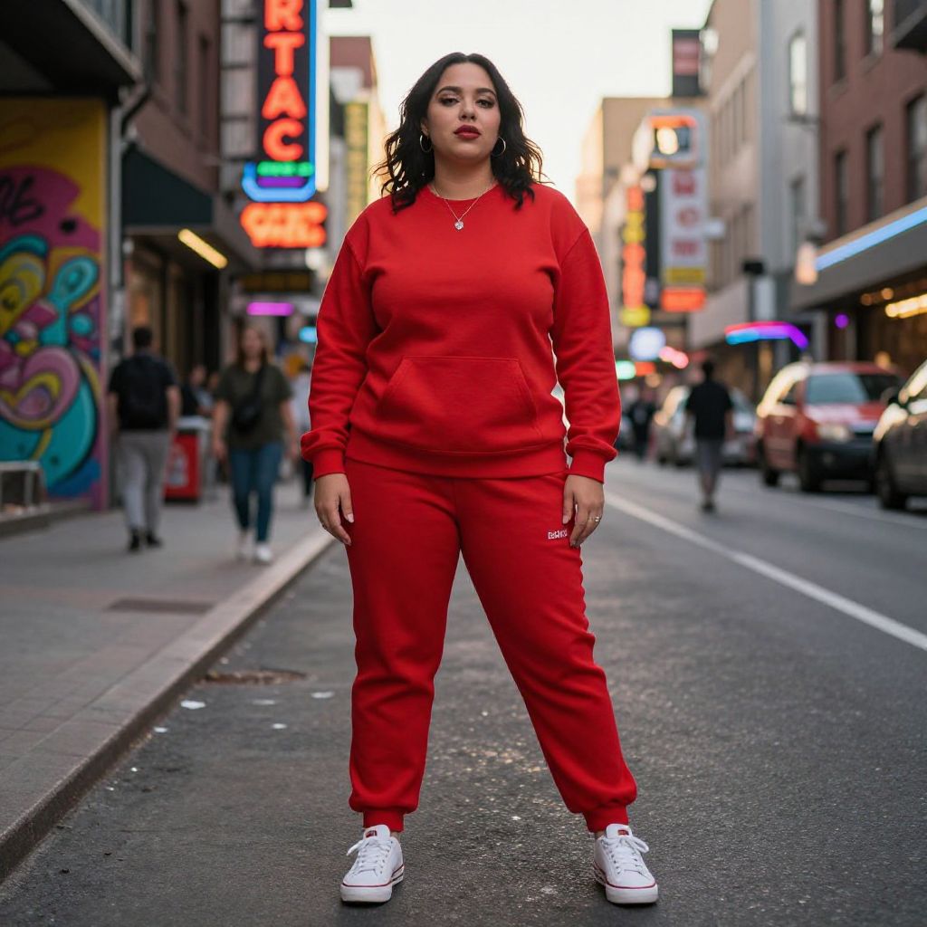 Photograph of a confident, plus-sized Latina woman with curly black hair, wearing a bright red tracksuit and white sneakers, standing in a bustling urban