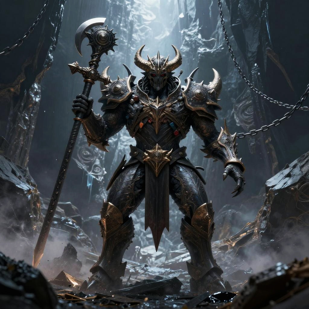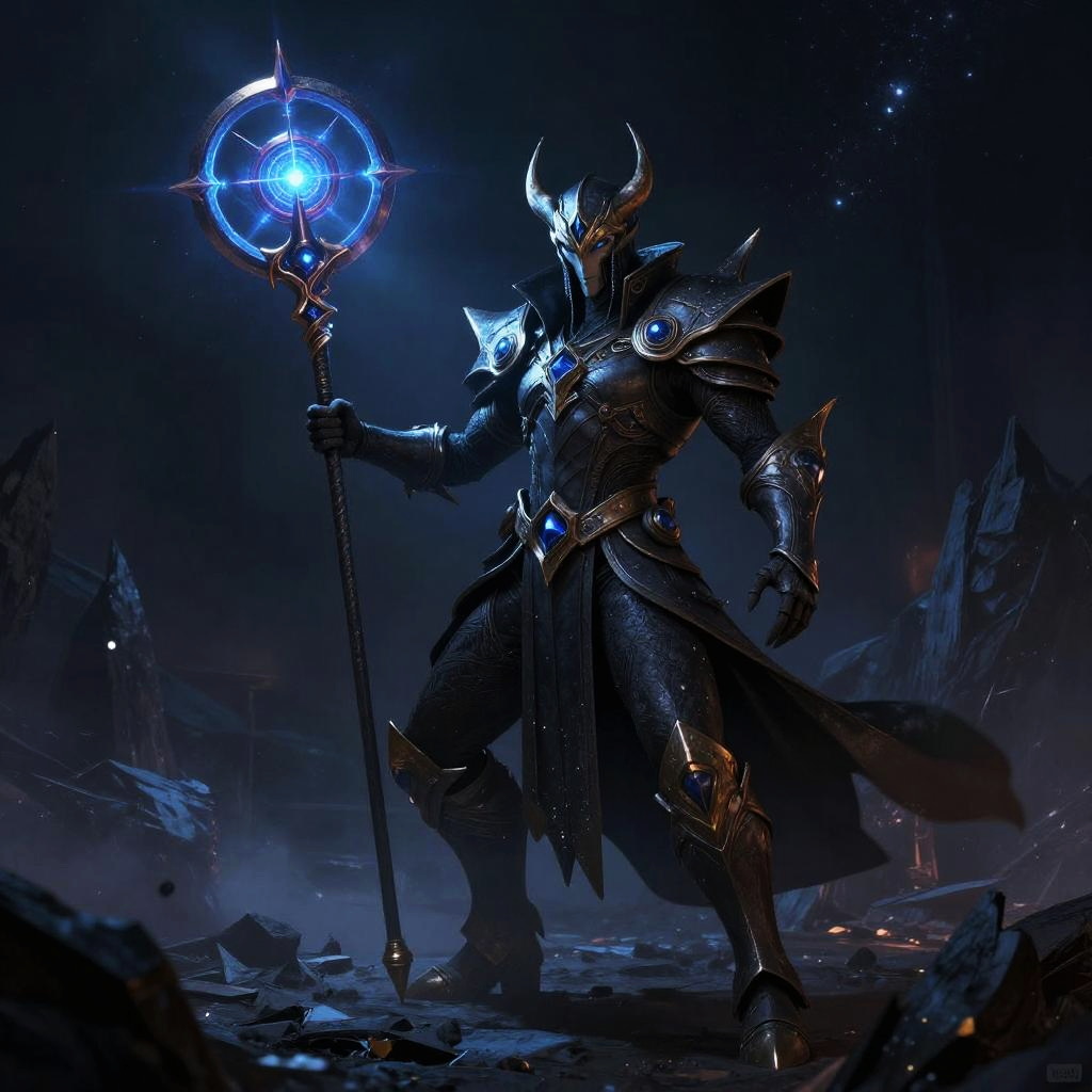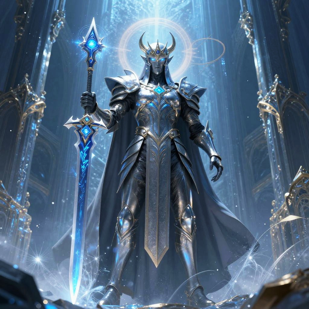 A heavily armored knight standing on rocky terrain with a mountainous background and the sun setting behind. The knight wears dark metallic armor with golden edges and holds a shield emitting a bright blue glow, suggesting magical properties.
