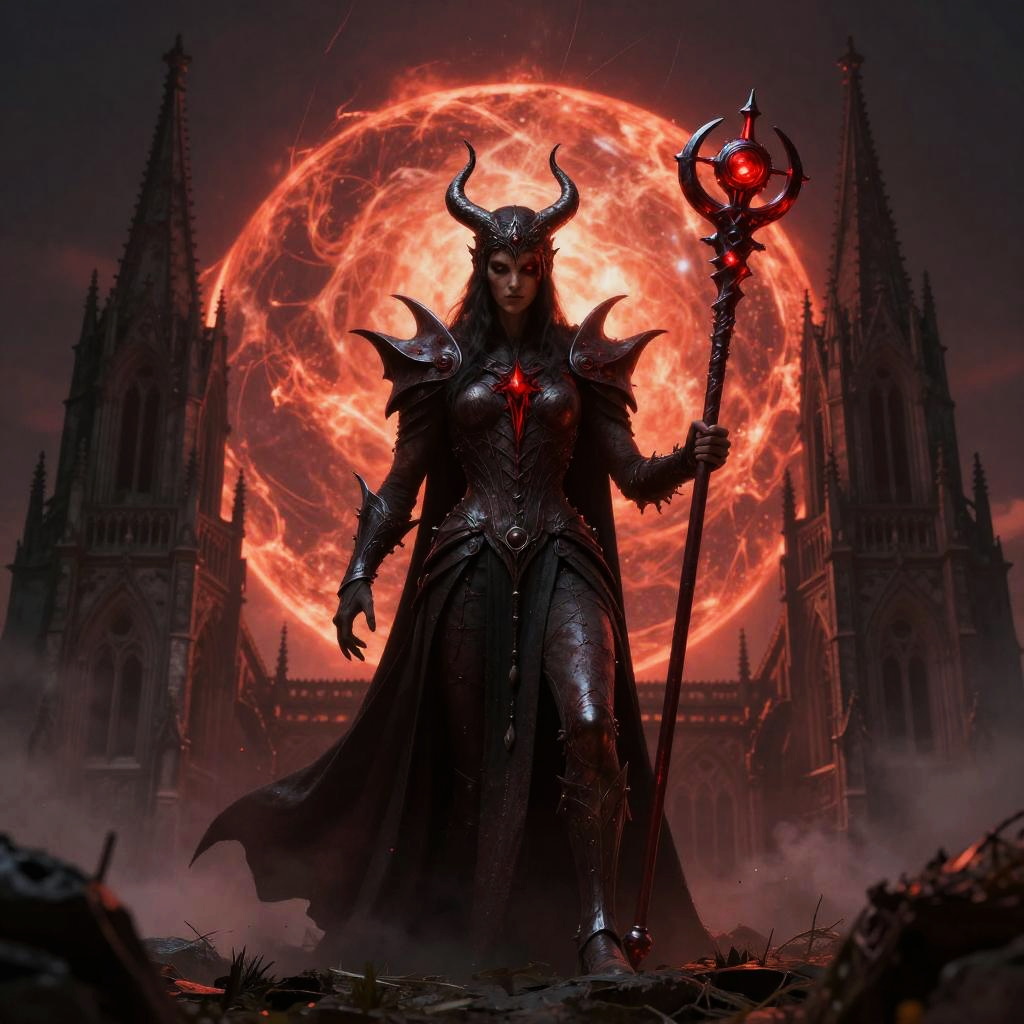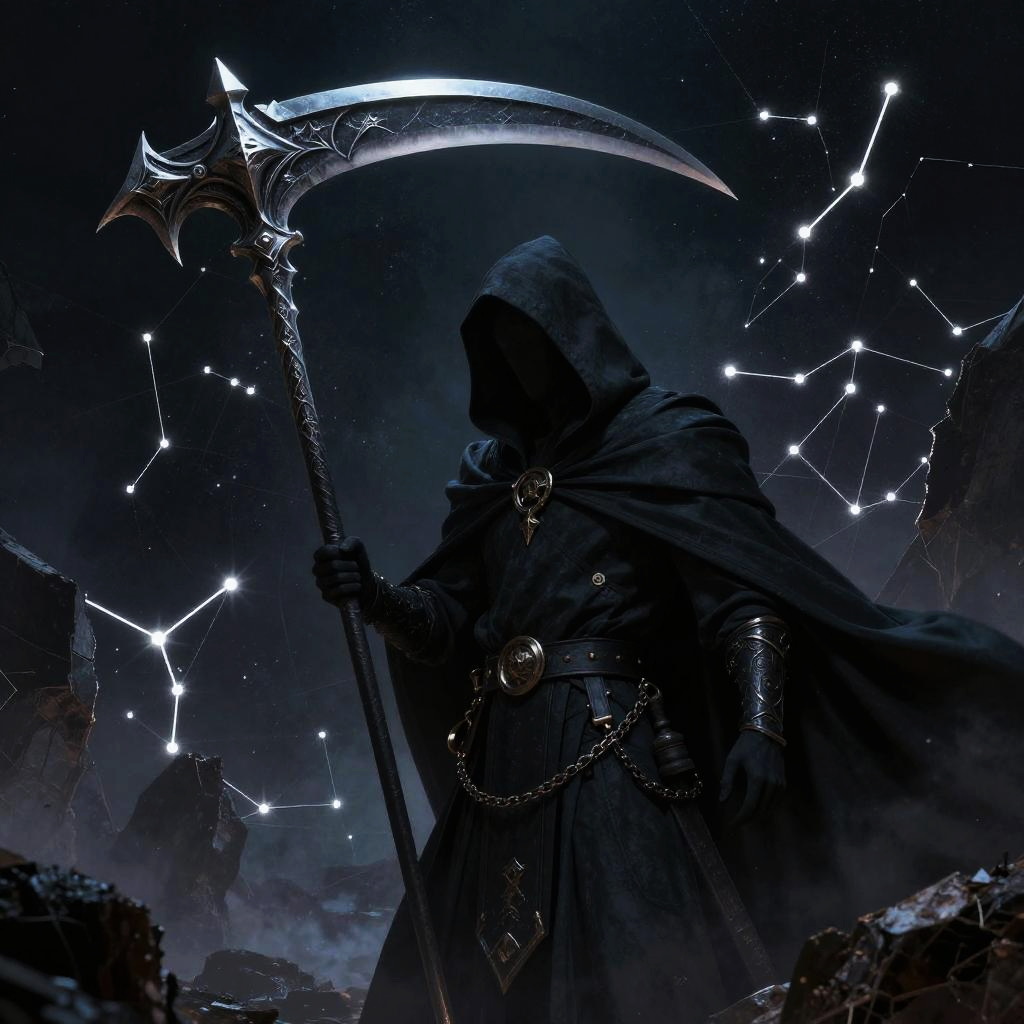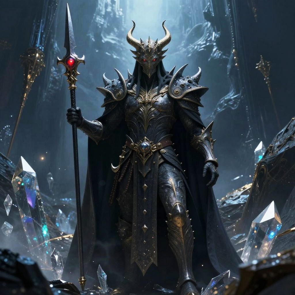 A heavily armored knight standing on rocky terrain with a mountainous background and the sun setting behind. The knight wears dark metallic armor with golden edges and holds a shield emitting a bright blue glow, suggesting magical properties.