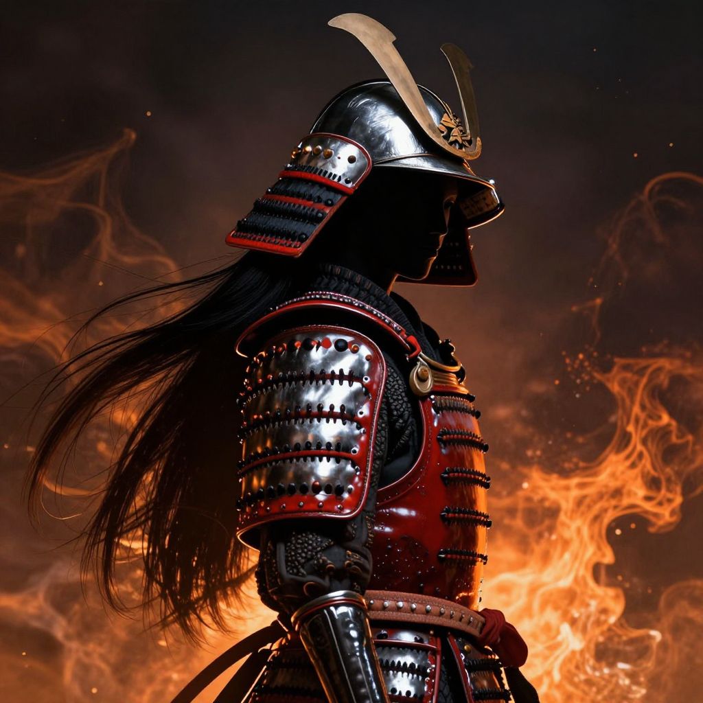 Photorealistic digital art of samurai in shiny red and black armor, helmet with crest, long black hair, set against fiery orange background.