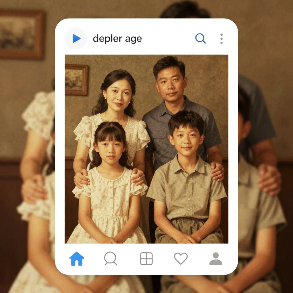 Photo ager application processing an old family photo turning vibrant and aged simultaneously, featuring warm golden sepia tones and digital painting style, with intricate details of skin texture changes and subtle expressions on a cozy vintage background.