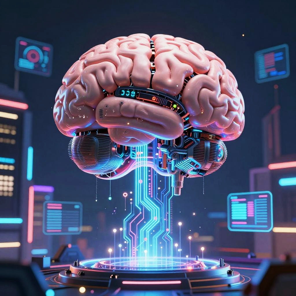 Concept art depicting a futuristic robotic brain emerging from glowing digital data streams and holographic interfaces. The brain integrates mechanical and organic elements illuminated by vibrant neon circuits, set against a cyberpunk cityscape background with sharp details and a high-tech atmosphere.