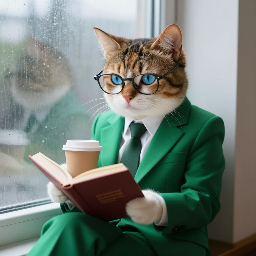 Photo-realistic, higly-detailed, cat in green business suit, cat with glasses, calico kitty holding coffee reading book, sitting next to window, rainy day, light blue eyes