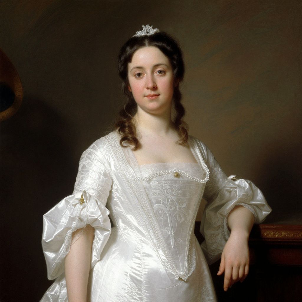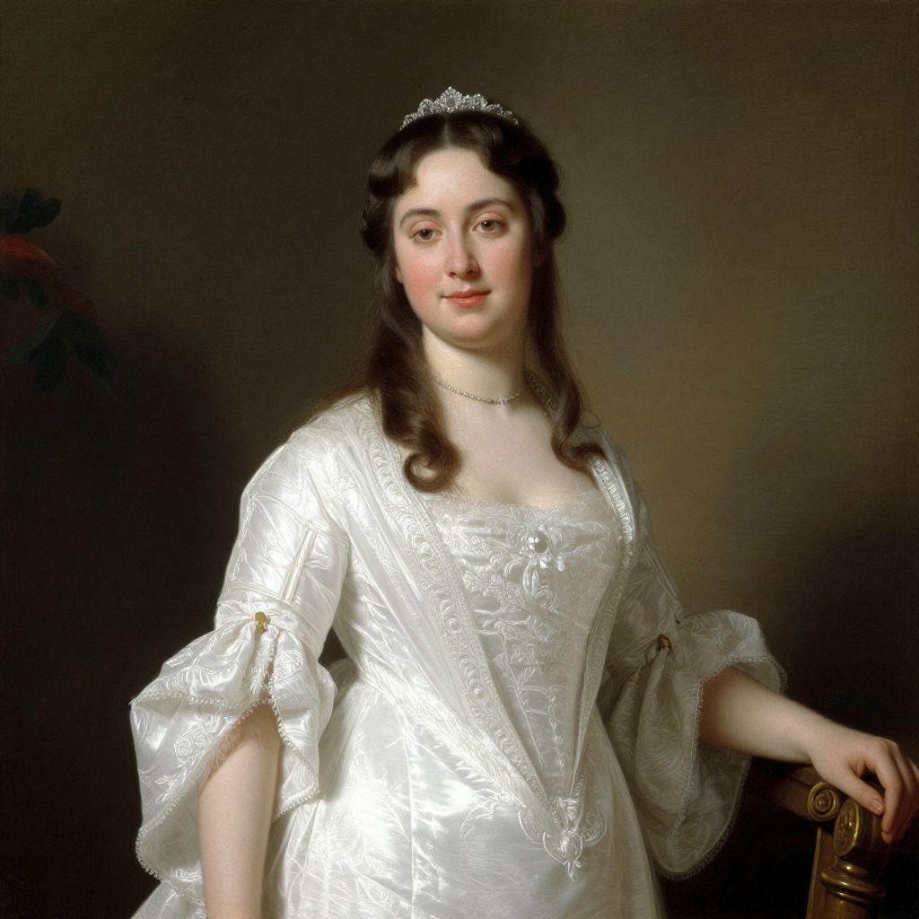 A regal portrait rendered in the classical academic style of Léon-François Comerre, featuring a woman adorned in an elegant white gown with intricate detailing, set against a richly textured backdrop, exemplifying the refined elegance and compositional mastery characteristic of French academic portraiture.