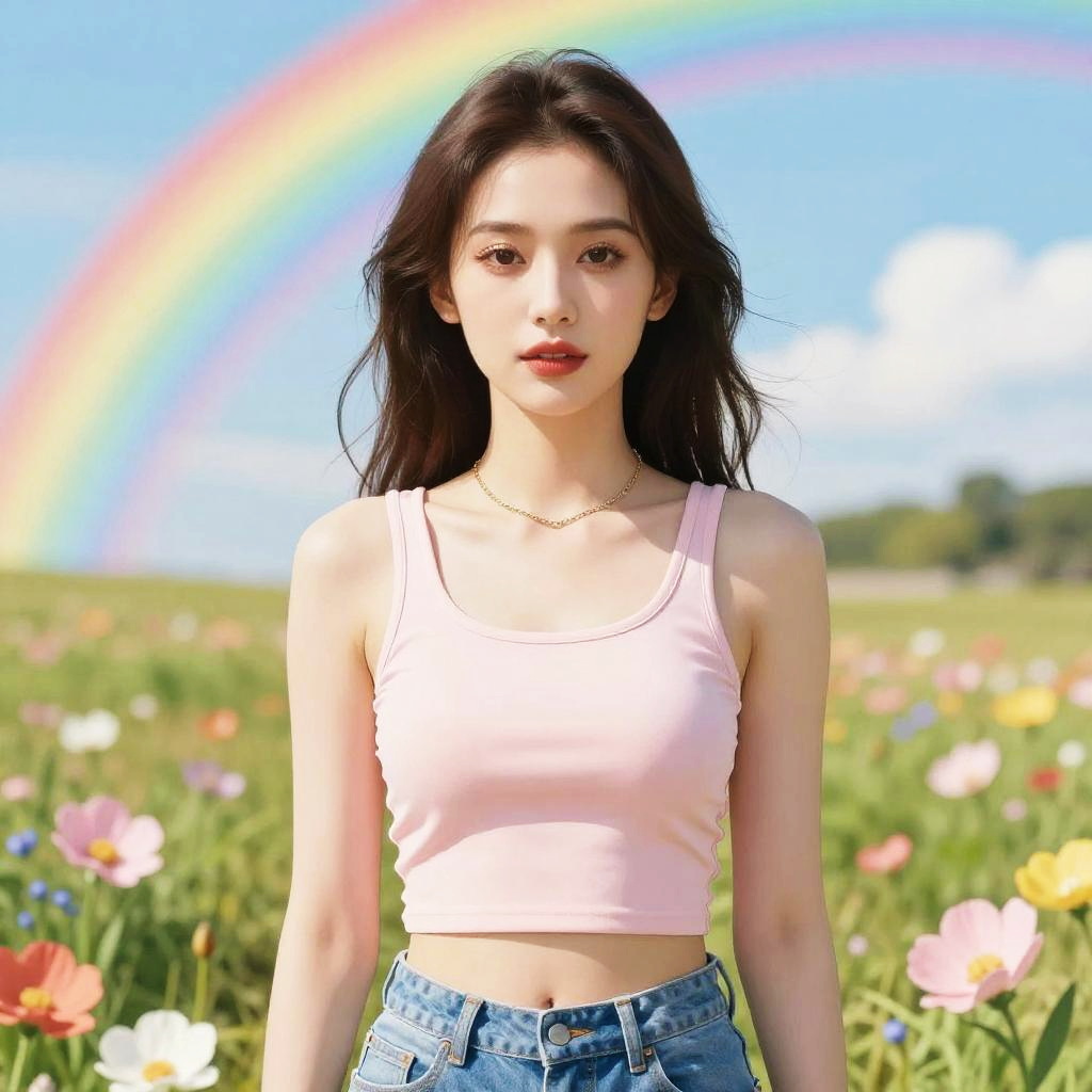 Photograph of an Asian woman with long, dark brown hair standing in a vibrant field of colorful flowers under a bright blue sky with a rainbow. She has fair skin and is wearing a light pink, sleeveless crop top that reveals her midriff, and high-waisted blue jeans. She has a subtle, natural makeup look with red lipstick and a thin gold necklace. The background features a blurred, lush green field with a rainbow arching across the sky. The image has a soft, slightly digital enhancement effect, giving it a dreamy, surreal quality.