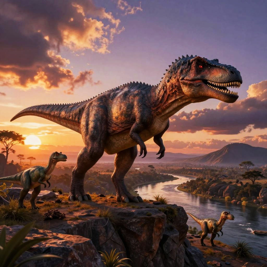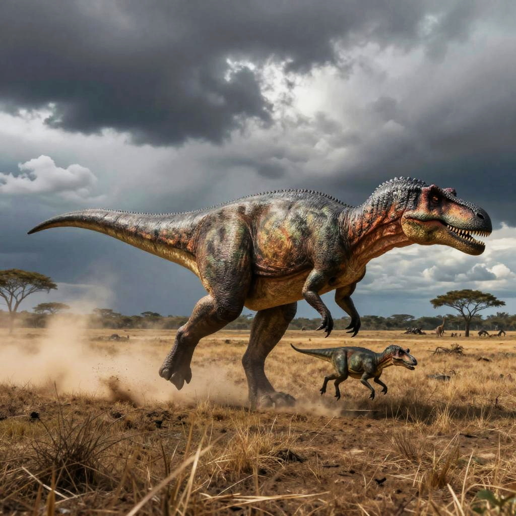 Giganotosaurio hunting in a vast open dinosaur-era plain under a stormy sky, dynamic pose chasing prey, dust kicked up trailing behind it, detailed anatomical accuracy with powerful legs and tiny arms, photorealistic rendering with epic wide-angle perspective.