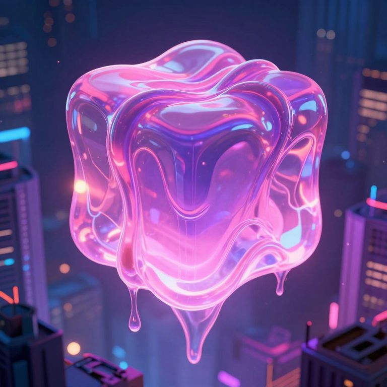 Neon pink and blue, translucent, jelly-like orb with dripping edges floats above a futuristic cityscape of glowing skyscrapers. CGI artwork.