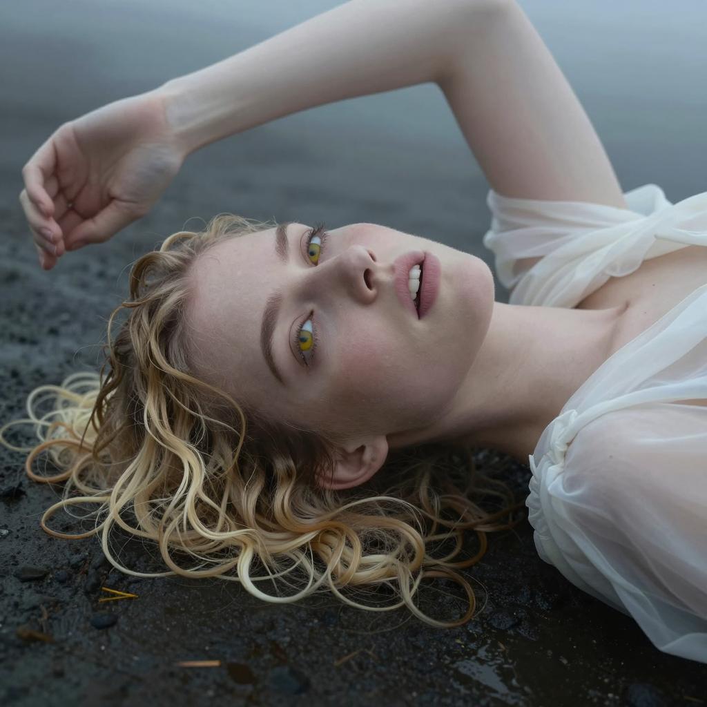 Woman with wet, curly blonde hair lying on a dark, foggy surface. She has pale skin, yellow eyes, and slightly open mouth with visible teeth. Her right arm is raised. She wears a white, semi-transparent cloth around her shoulders. The background is misty and blurred. Close-up shot.
