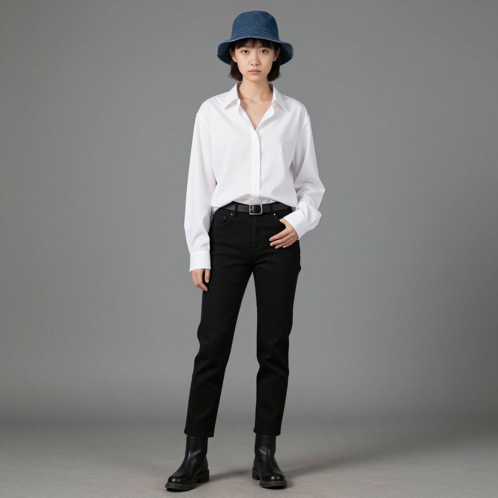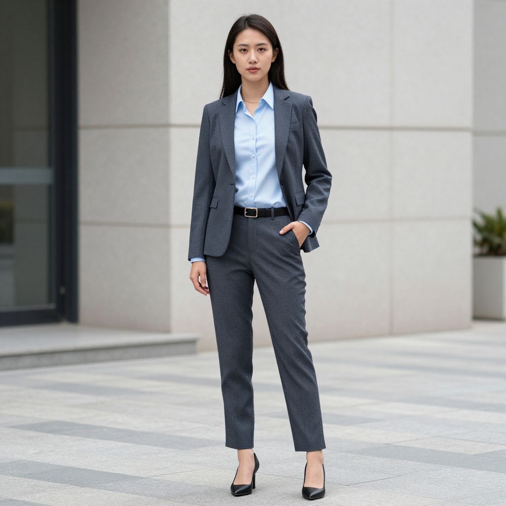 "navy blue outfit female, solo, 1girl, realistic, blue shirt, standing, full body, shirt, black hair, pants, looking at viewer, asian, ponytail, blue pants, closed mouth, long sleeves, black footwear, arms at sides Realistic photo of casual sexy person with pretty face"